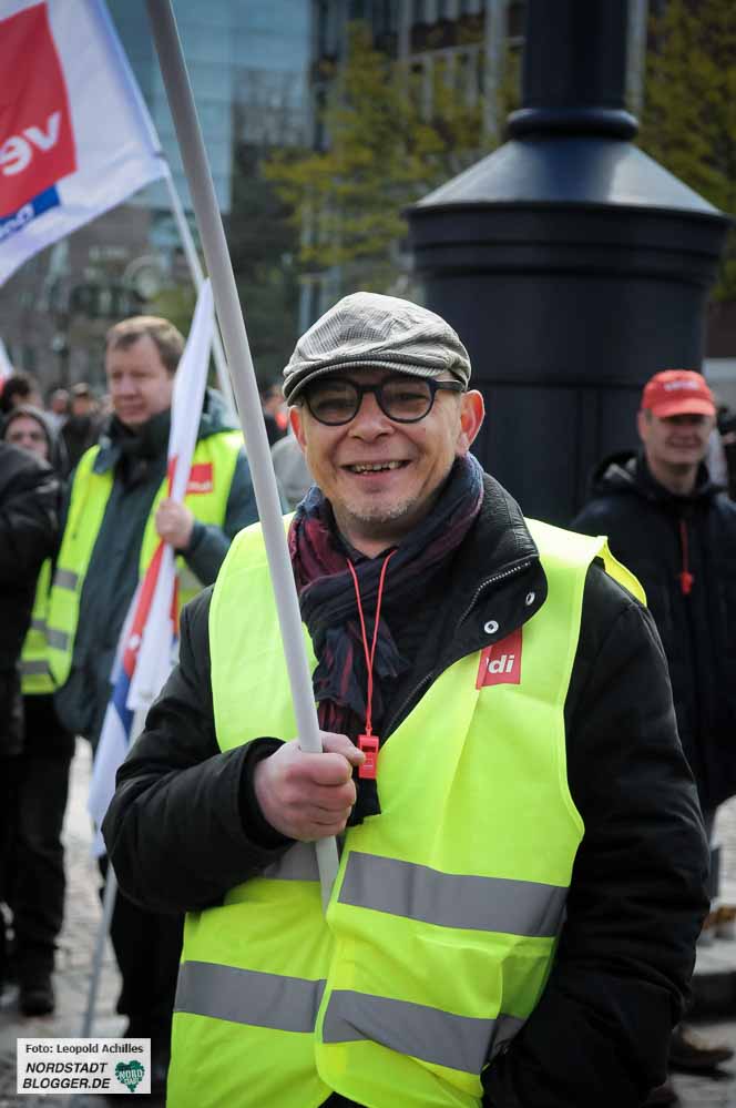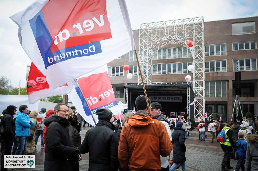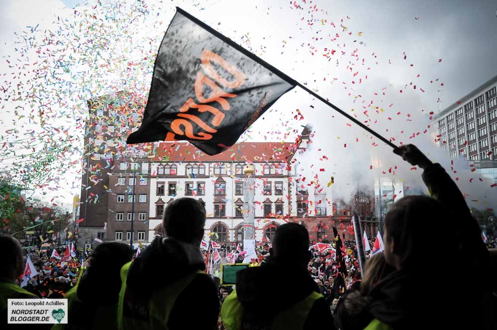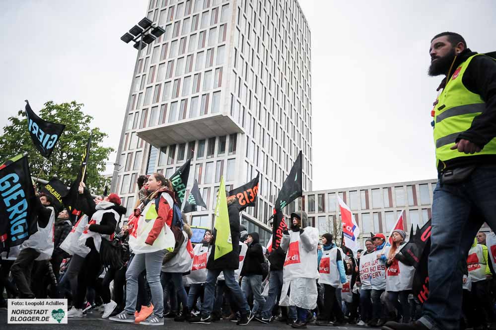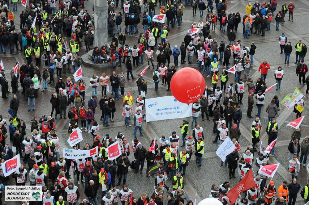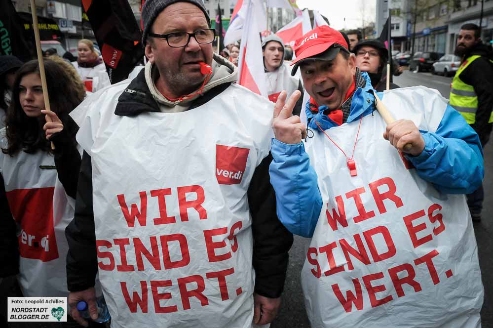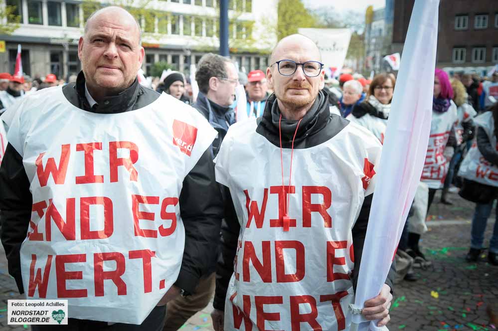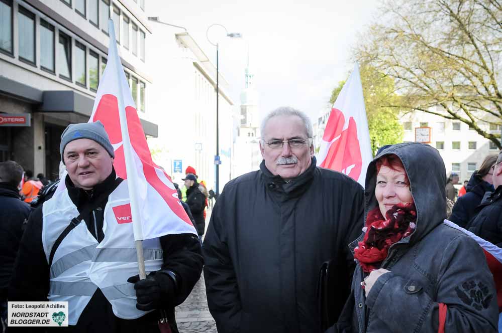 Obwohl das Wetter alles andere als streikfreundlich war, beteiligten sich dennoch insgesamt rund 8000 Verdi-Mitglieder am Warnstreik. Sternförmig waren die TeilnehmerInnen mit Fahnen und „Wir sind es wert“-Westen aus vielen Städten der Umgebung von sechs Sammelpunkten aus zum Friedensplatz zur Abschlusskundgebung gezogen.