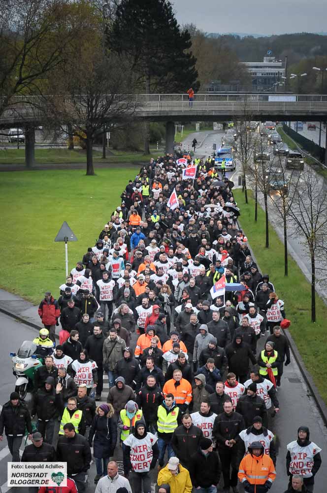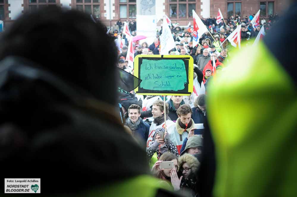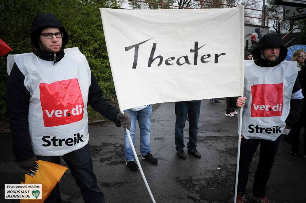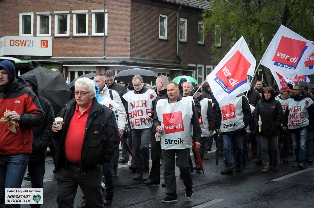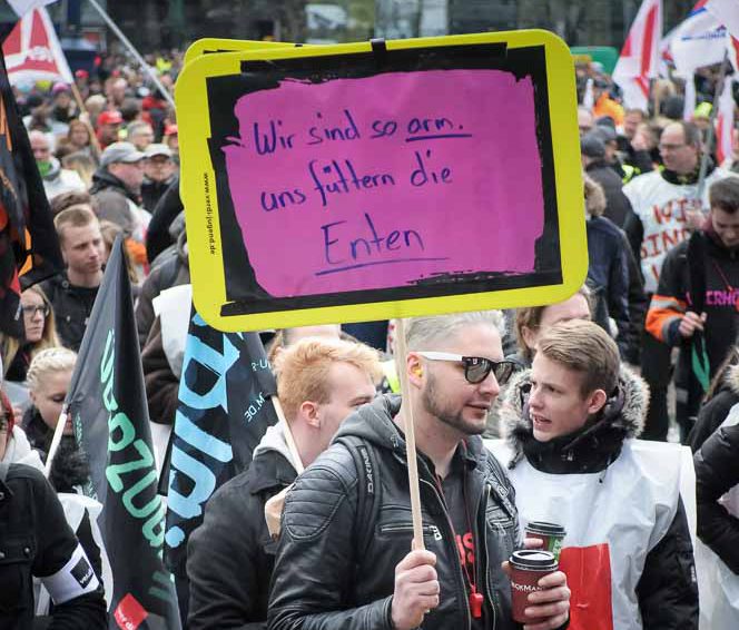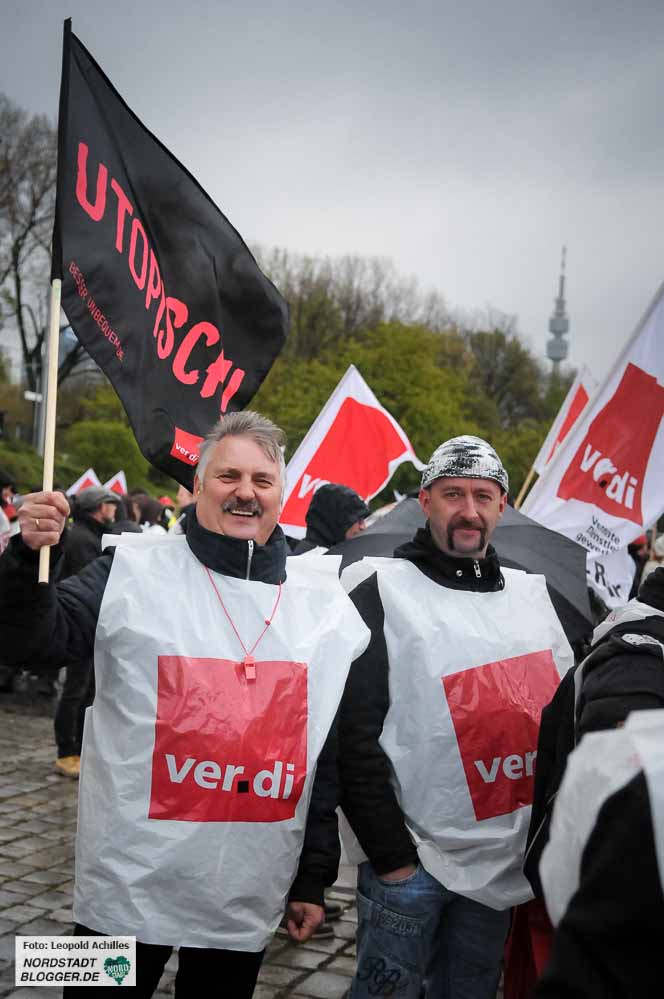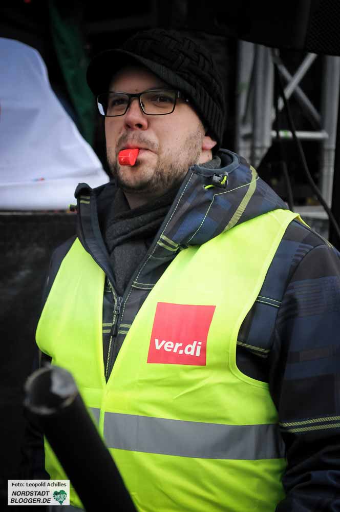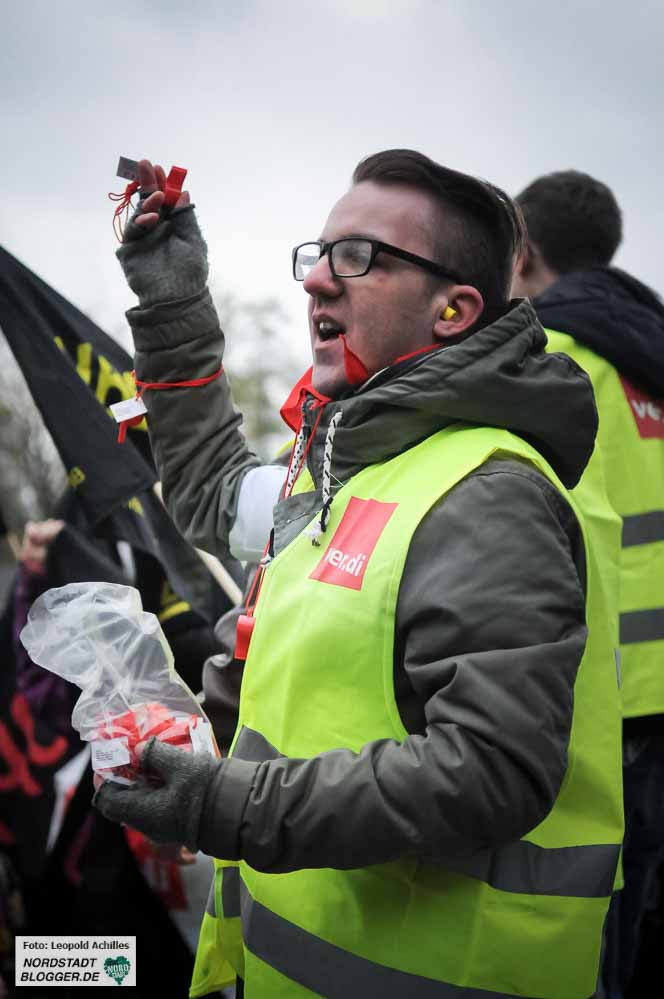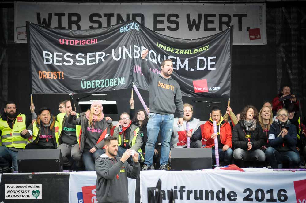Obwohl das Wetter alles andere als streikfreundlich war, beteiligten sich dennoch insgesamt rund 8000 Verdi-Mitglieder am Warnstreik. Sternförmig waren die TeilnehmerInnen mit Fahnen und „Wir sind es wert“-Westen aus vielen Städten der Umgebung von sechs Sammelpunkten aus zum Friedensplatz zur Abschlusskundgebung gezogen.