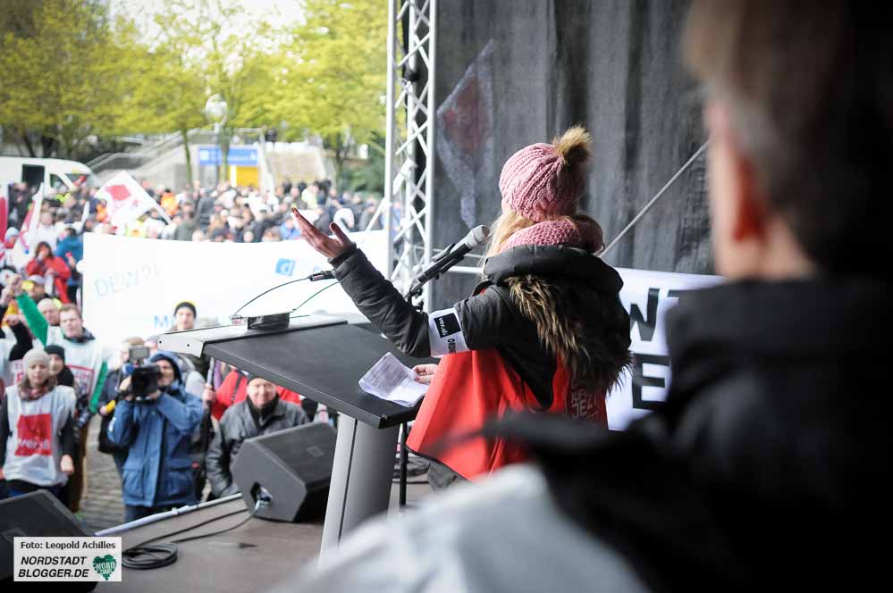 Das wenig freundliche Frühlingswetter sorgte für eine Straffung des vorgesehenen  Programmablaufs. Nur drei statt der geplanten fünf Redner sprachen von einer großen Bühne vor dem Rathaus zu den TeilnehmerInnen.
