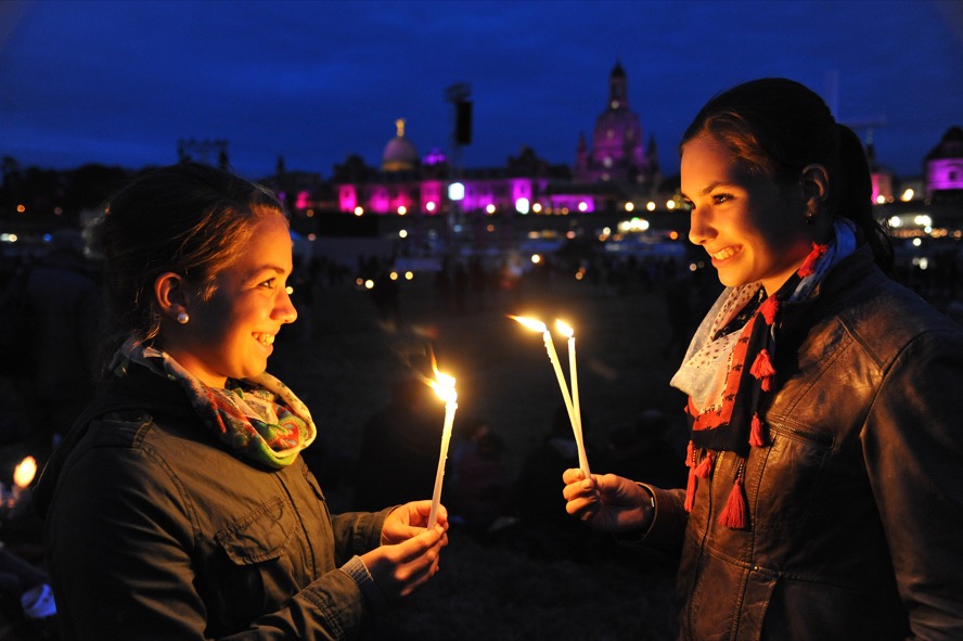 33.Deutscher Evangelischer Kirchentag vom 01.06.bis 05.06.2011 in Dresden. Abendsegen - Licht und Klang schliessen den Abend der Begegnung am 01.06.2011 ab. An den Ufern beiderseits der Elbe, erstrahlt ein Lichtermeer aus 150.000 Kerzen.