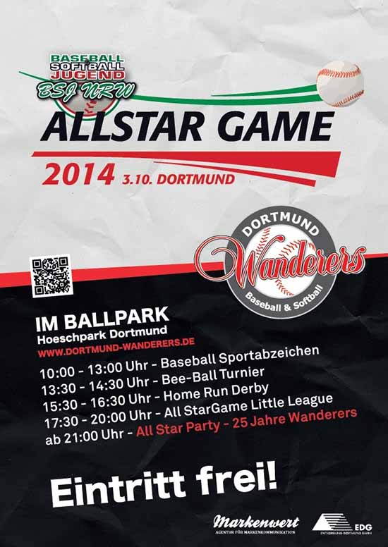Am Tag der Deutschen Einheit (3.Oktober) veranstalten die Dortmund Wanderers in Kooperation mit dem BSJ NRW, einen langen Tag des Nachwuchses im Baseball im Hoeschpark und möchten im Anschluss auf ‚25 Jahre Dortmund Wanderers‘ anstoßen.