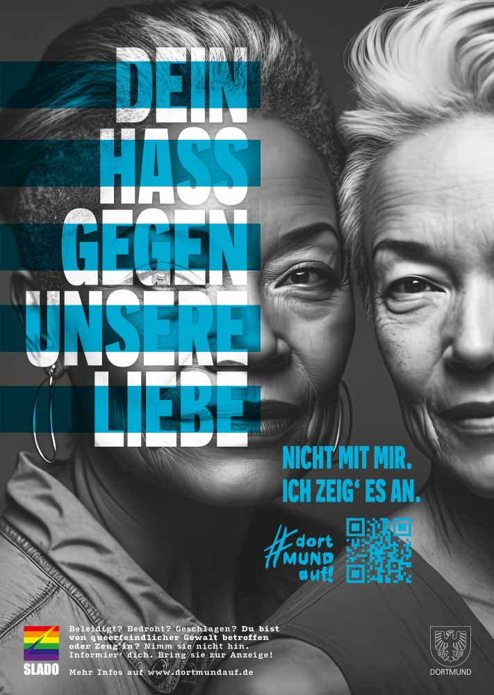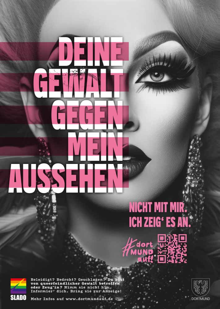 Die auf den Plakaten verlinkte Website www.dortmundauf.de informiert ausführlich über Handlungsmöglichkeiten. „Für viele queere Menschen ist der Gang zur Polizei nicht unbedingt der erste Weg. Wir zeigen deshalb, wo Betroffene weitere Unterstützung finden. Wichtig ist nach einem Gewaltvorfall aktiv zu werden und sich selbst zu schützen. Eine Anzeige kann zum Schutz anderer vor weiterer Gewalt beitragen“, erklärt Klammer.