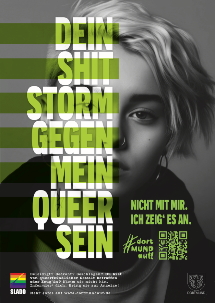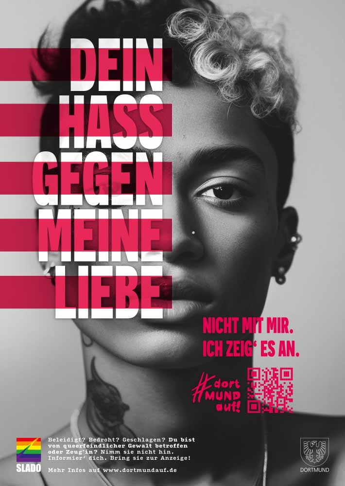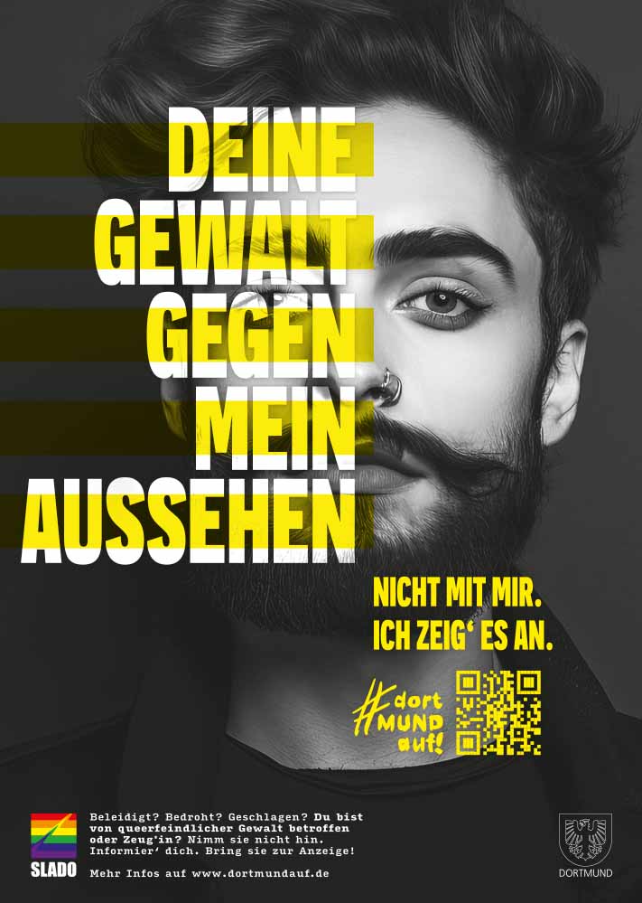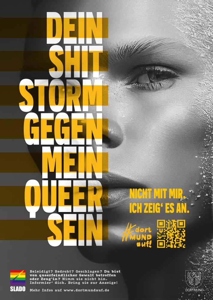 Zum Pride Month startet SLADO e.V., der Dortmunder Dachverband für Schwulen-, Lesben-, Bisexuellen- und Transidentenorganisationen eine neue Kampagne gegen queerfeindliche Gewalt. Unter dem Titel #dortMUNDauf ruft SLADO Betroffene und Zeug:innen dazu auf gegen Angriffe, Beleidigungen und Bedrohungen aktiv zu werden. Die Kampagne entstand in Kooperation mit der Dortmunder Kreativagentur helloyou.studio und der Koordinierungsstelle für LSBTIQ* der Stadt Dortmund.