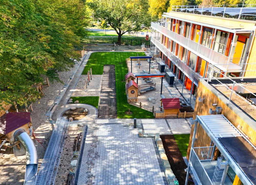 Auch in Sachen Klimaschutz setzt die neue Kita Maßstäbe. Sie wurde als Passivhaus errichtet, das durch eine gute Dämmung und den Einsatz einer Wärmepumpe mit besonders wenig Energie auskommt. Bereits bei der Bauweise wurde auf klimaschonende Materialien geachtet. Die Kita wurde seit Februar 2023 geplant und in nur zwölf Monaten Bauzeitfertiggestellt. Die Gesamtkosten lagen bei 18,6 Millionen Euro.