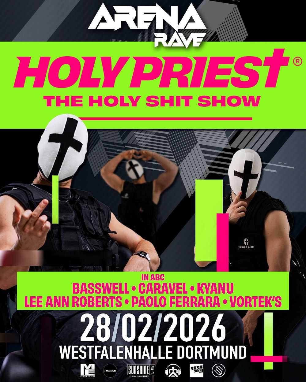 Als Headliner führt Holy Priest das Line-up an. Der DJ und Producer gilt als Senkrechtstarter der Szene, der sich in kurzer Zeit eine globale Fanbase erspielt hat und derzeit zu den gefragtesten Acts zählt. Nach viralen Erfolgen und ausverkauften Shows in Europa bringt er seinen Hype mit dem eigenen Show-Konzept „The Holy Shit Show“ nach Dortmund.