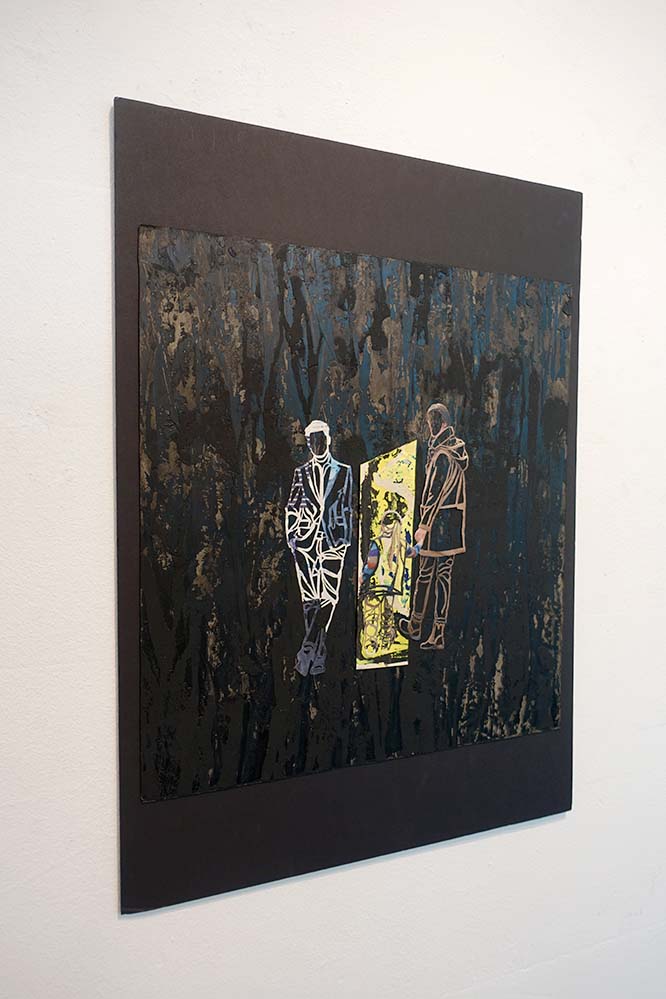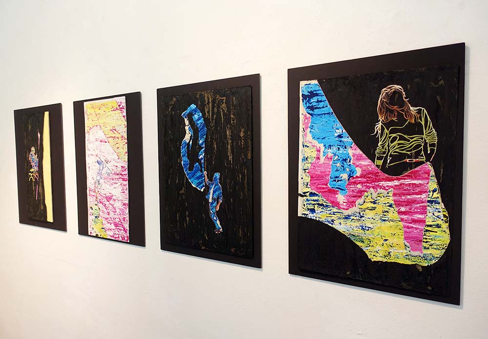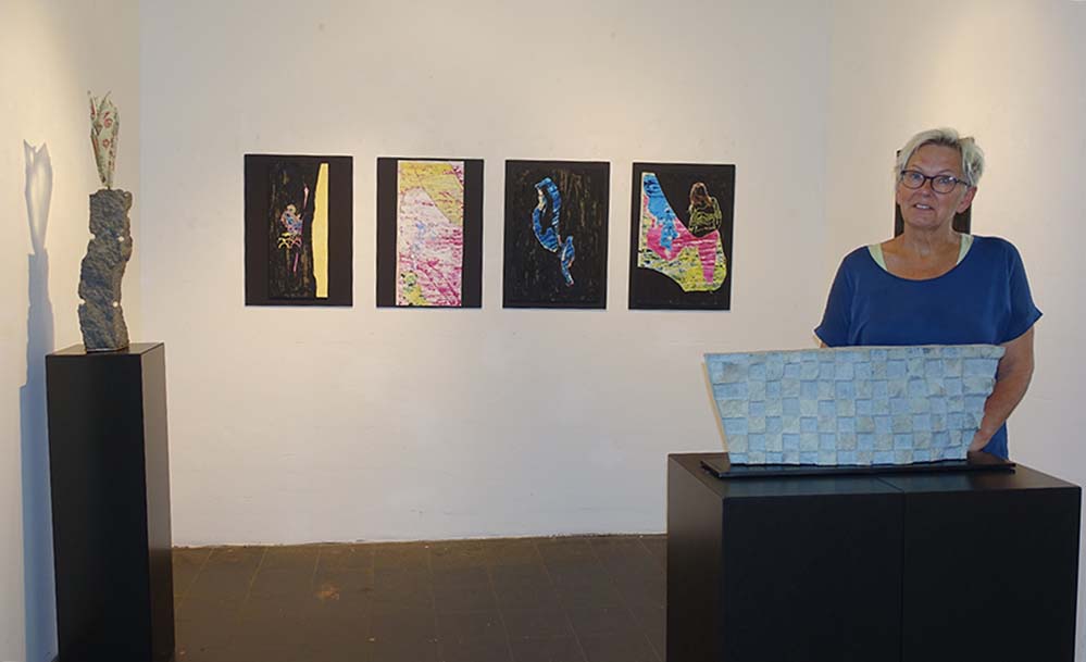 In zwei der Siebdrucke sind Collagetechniken zu erkennen. „Ich habe eine Zeit lang Werbungen gesammelt und ausgeschnitten, um sie in Bildern zu verwenden“, antwortet die Künstlerin auf Nachfrage. Bei den anderen erkennt der Betrachter, dass die Siebdrucke in Schichten entstanden sind. Verwobene Wandbilder, verwobene Skulpturen, vielschichtige Bilder zeigen eine vernetzte, vielfältige Welt aus der Sicht von Sabine Klemp.