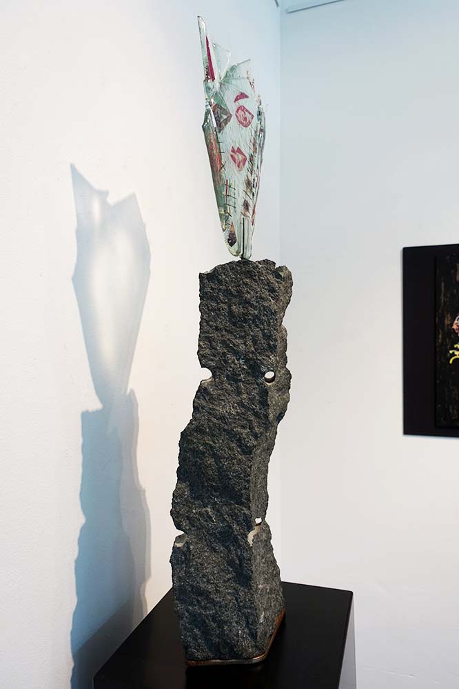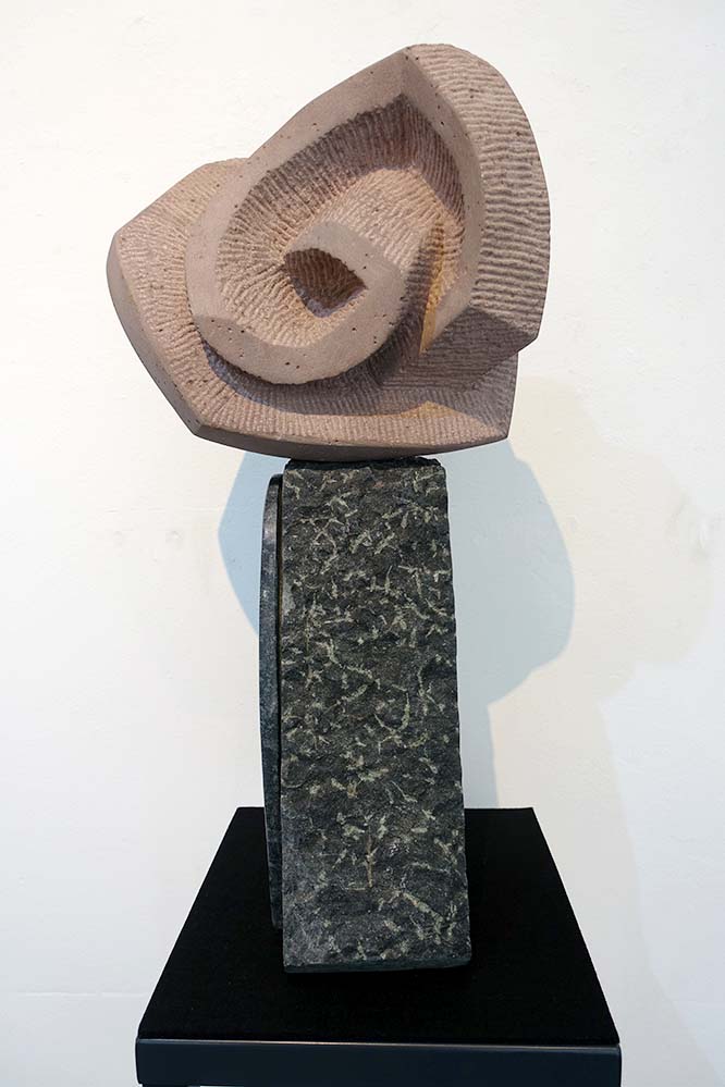 Der Knoten aus Stein – aus einem Galstone, multicolor, einem Speckstein nicht unähnlich – ist ein Faszinosum in sich. Der Betrachter ist verblüfft, vermutet ein dickes Stoffband vielleicht, doch es ist bearbeiteter Stein – zugleich massiv und doch von bestechender Leichtigkeit.