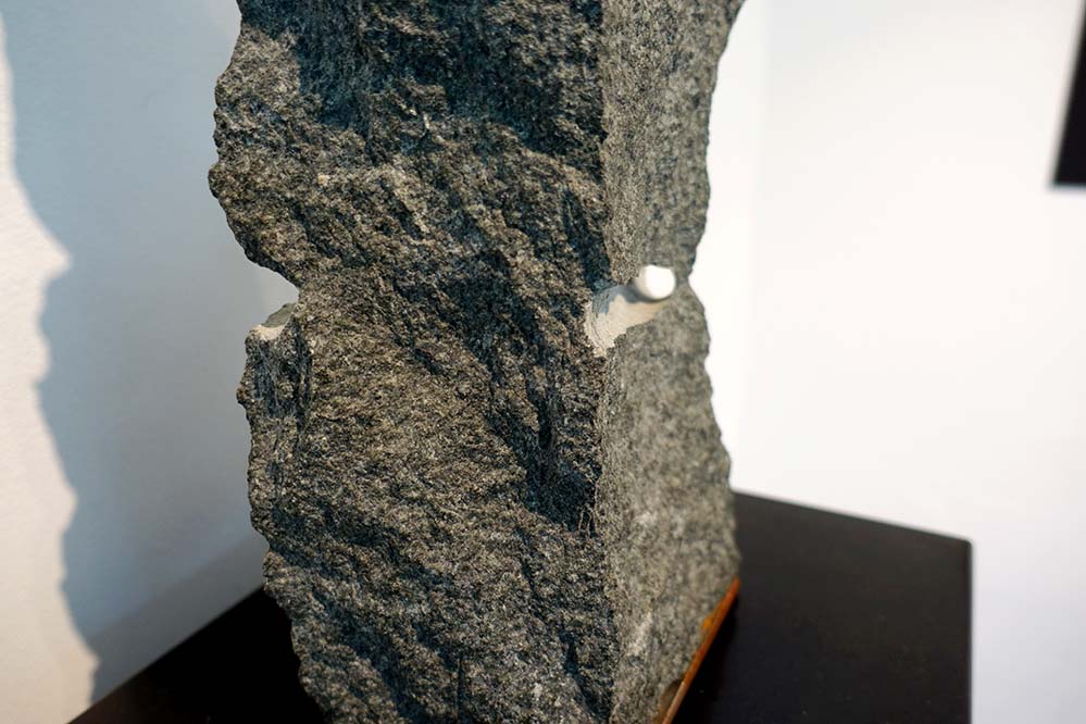 Der wächserne Schein des Steinknotens, ein Gordischer Knoten vielleicht, lädt zum befühlen ein. Da der Stein weich ist, sollte die Hand bitte unberingt sein, um die Oberfläche nicht zu zerkratzen. „Damit wären gut 100 Stunden Arbeit ruiniert. Das Schleifen alleine dauerte eine gefühlte Unendlichkeit“, lacht die Künstlerin.