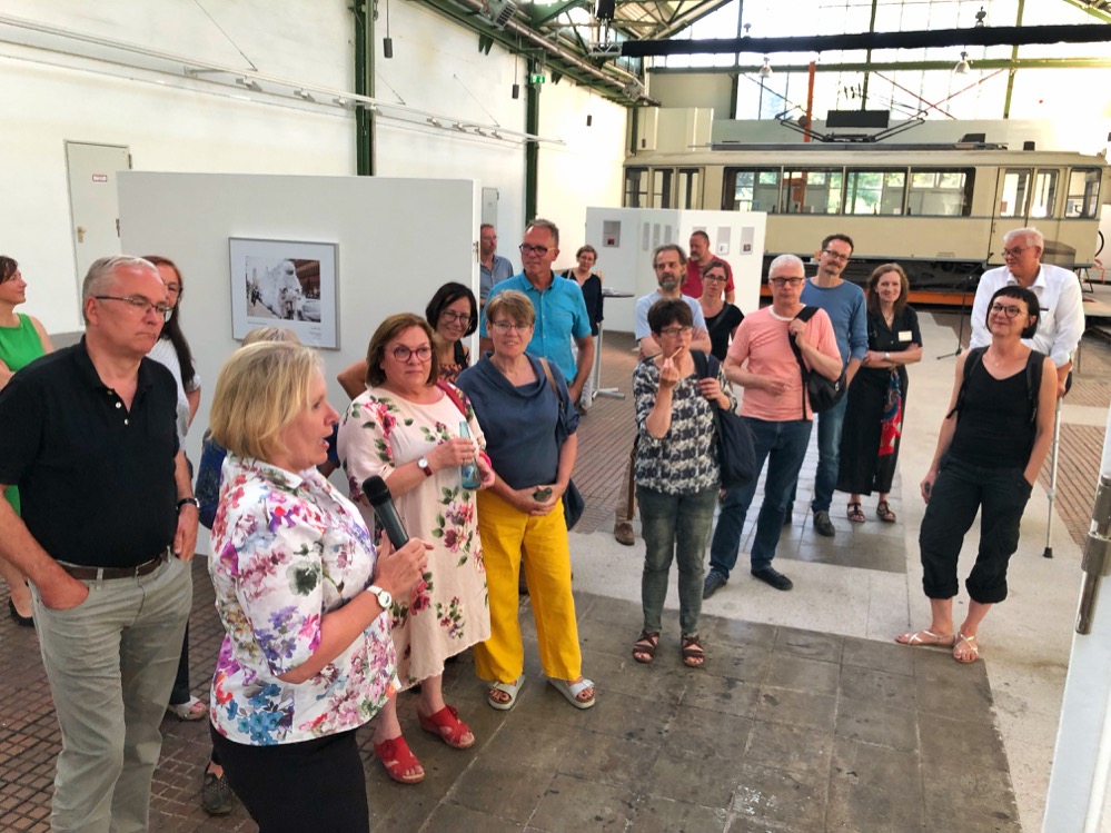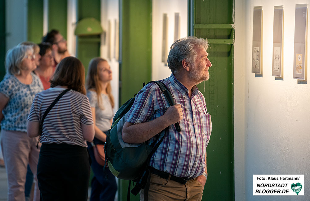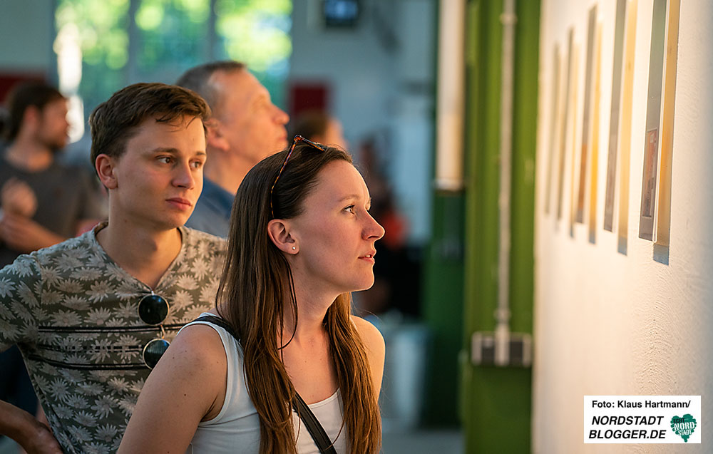 Michaela Veith – sie hat selbst in Dortmund Journalismus studiert – freut sich über die neue Location für die Rückblende. Die Gäste der Eröffnung führte sie durch die Ausstellung und wusste die ZuhörerInnen mit zahlreichen Hintergründen zu den Arbeiten und Details zum Wettbewerb zu unterhalten. Noch bis zum Sonntag sind die Arbeiten im hinteren Teil der Werkhalle des Depots zu sehen.