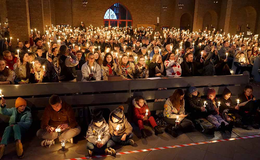 Alle Pfadfinderinnen und Pfadfinder sind zu diesem Gottesdienst eingeladen. Thorsten Hasse, Diözesankurat der katholischen Deutschen Pfadfinderschaft St. Georg (DPSG), und der evangelische Landesjugendpfarrer Christian Branko Uhlstein nehmen dort das Friedenslicht in Empfang und geben es an die Besucherinnen und Besucher weiter. Diese reichen es untereinander weiter und tragen die Flamme anschließend in ihre Verbände und Gemeinden.