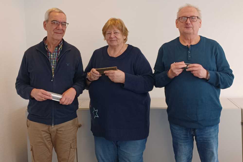 Brigitte Scheller ist schon seit 11 Jahren dabei, seit acht Jahren hat sie die Leitung der gut gelaunten Musiktruppe inne. Und die drei lassen sich trotz schrumpfender Musikerzahl, die Freude am Mundharmonika spielen nicht nehmen. Regelmäßig mittwochs und freitags treffen sie sich zur Probe im Wilhelm-Hansmann-Haus (WHH) in der Märkischen Straße. Scheller erzählt: „Vor der Pandemie hatten wir 15 Mitglieder, mittlerweile sind wir sechs, heute sind wir allerdings krankheitsbedingt nur zu dritt.“