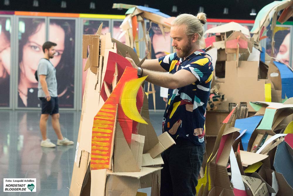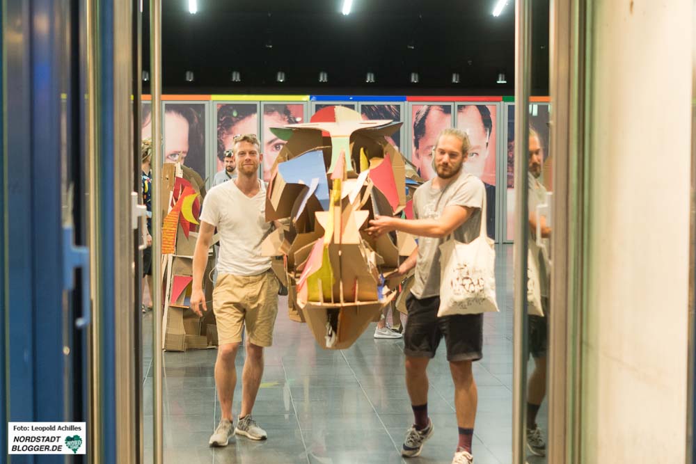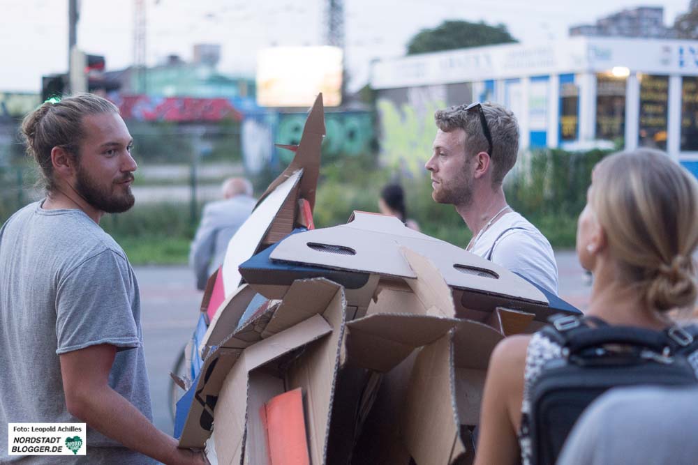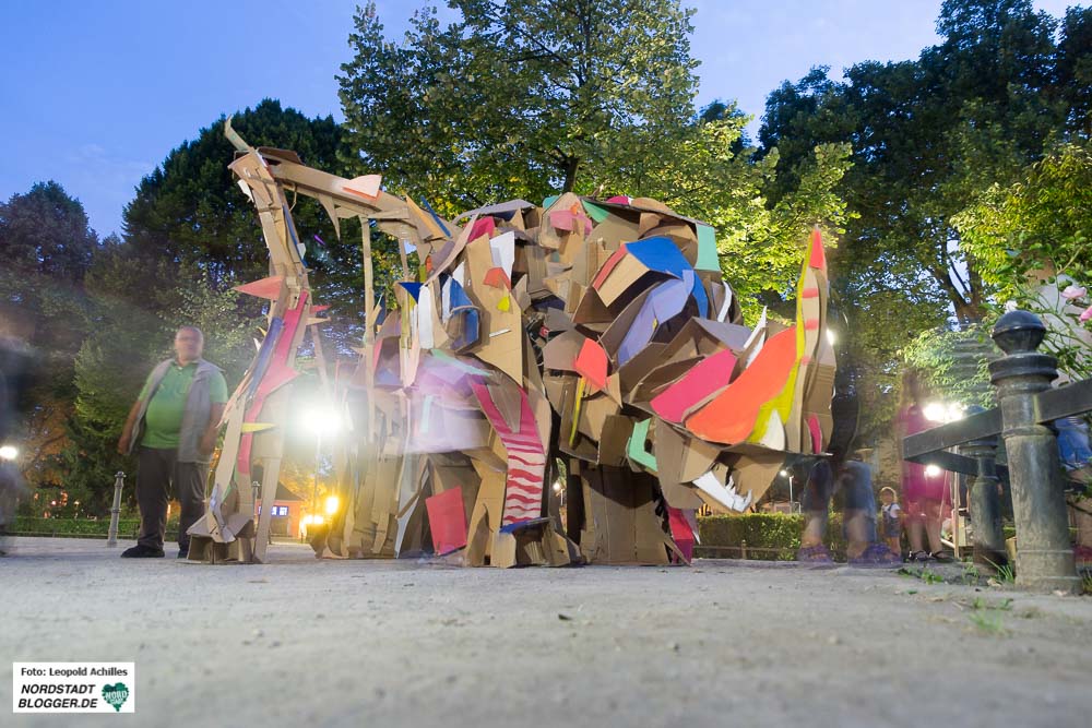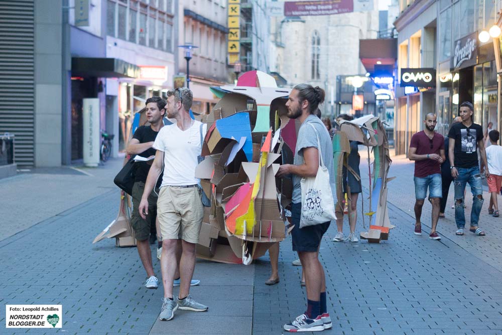 Am Dienstagabend um 20 Uhr ging Felix Meermann mit Freunden, Verwandten und weiteren Interessierten mit seinem Nashorn bis auf den Nordmarkt. Begleitet wurde der Umzug von zwei TrompeterInnen, die das Nashorn und sein Gefolge geräuschvoll ankündigte. Auf dem Weg vom Konzerthaus, über Brückstraße und Münsterstraße bis hin zum Nordmarkt sah man viele positiv irritierte und lachende Gesichter. Nach ungefähr einer Stunde auf dem Nordmarkt angekommen, baute der 28-jährige sein Papp-Tier wieder auf und überließ es dem Norden Dortmunds und besonders den Menschen auf dem Nordmarkt.