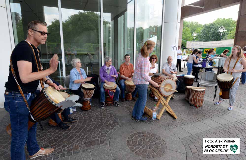 Beim gemeinsamen Mittagessen kann man auch mit Fremden ins Gespräch kommen und sich kennenlernen. Neben dem Essen gibt es auch musikalische Unterhaltung. Sie lädt zum Verweilen im Stadtgarten ein.