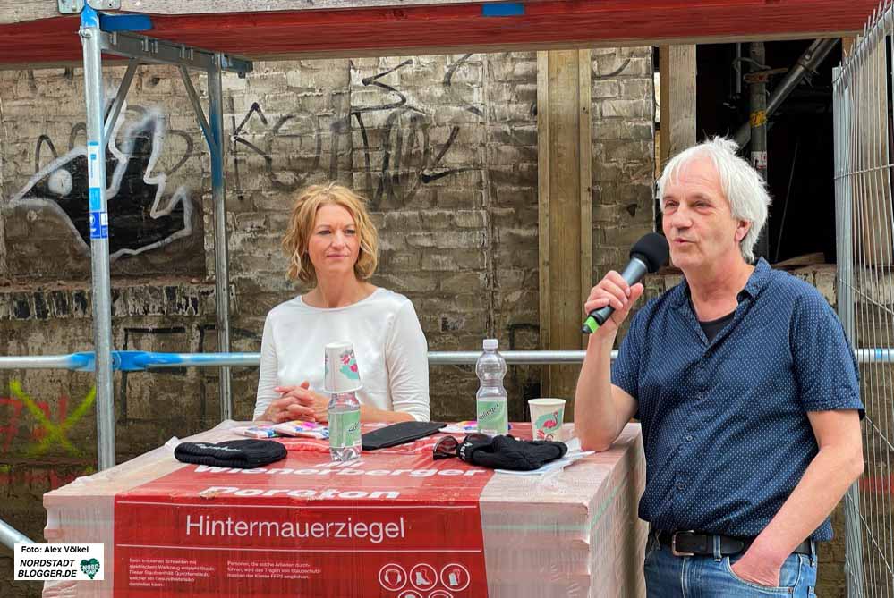 Wie das Gebäude einst aussah und wie derzeit, davon konnten sich die 30 Gäste bei der Corona-konformen Veranstaltung auf der Straße vor dem künftigen Heimathafen ein Bild machen. Eine Besichtigung der Baustelle war nicht möglich.