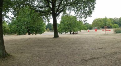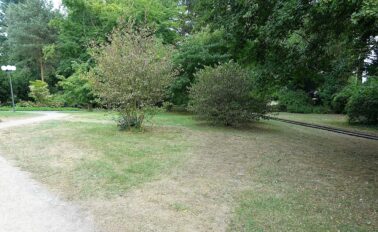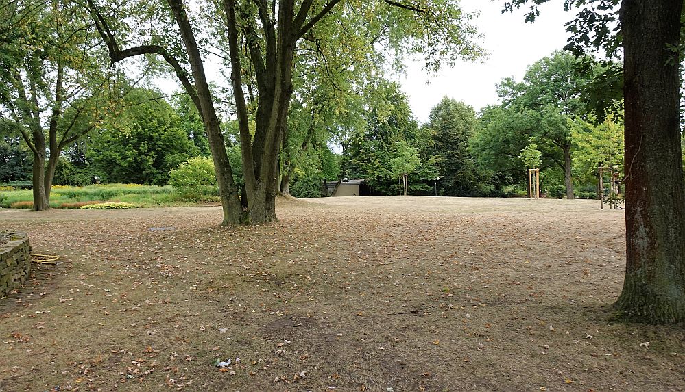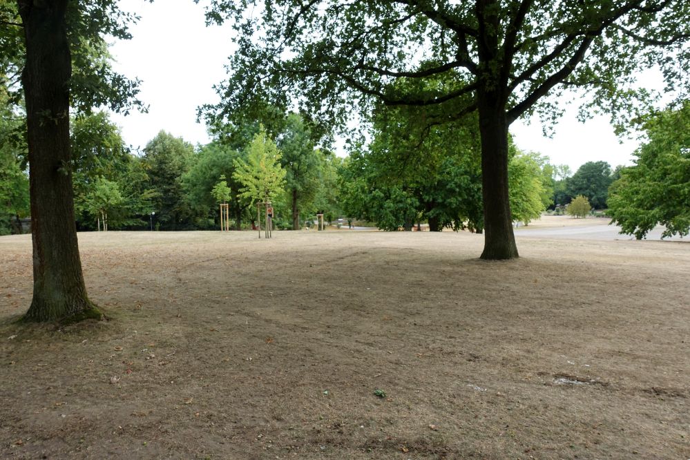 Ja, 20.000 BesucherInnen am Freitag, gleich 30.000 am Samstag – bei Juicybeats am letzten Juli-Wochenende; mit einer Festival-Mainstage, die im Park wie von selbst auf der Festwiese nah dem Eingang „Blütengärten“ an der Buschmühle lag. Vier Tage später ist fast aller Unrat beseitigt, aber das Wiesengrün hat sichtlich Federn gelassen. Genauer gesagt, ist von ihm so gut wie nichts mehr übrig – ein trostloser Anblick.