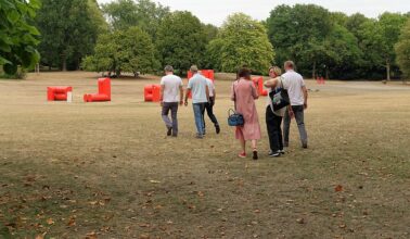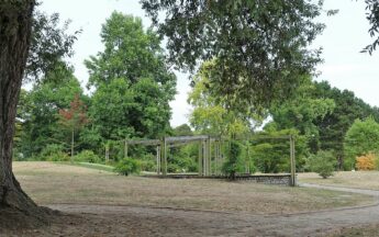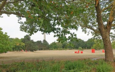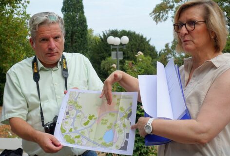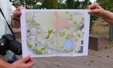 Aber die Wegeinfrastruktur ist nicht das alleinige Problemkind. Annette Kulozik hat für die CDU-Ratsfraktion bei ihrer Info-Tour durch den Park noch einen ganz besonderen Leckerbissen auf Lager: das allseits bekannte, 1969 zur Bundesgartenschau „Euroflor“ errichtete „Sonnensegel“. Allein der Weg dorthin, über die niedergetretene und von der Hitze ausgebrannte Festwiese, gleicht eher dem Gang durch eine Einöde. – Lässt nichts Gutes ahnen, oder?