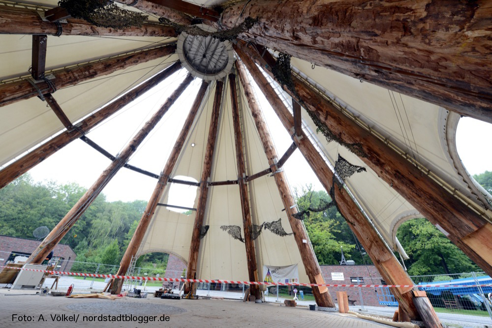 Das von der Weltausstellung Expo 2000 in Hannover übernommene größte Indianerzelt der Welt musste aufgrund festgestellter Feuchtschäden und Schädlingsbefall den Betrieb einstellen. „Wir haben hier das ganze Who is Who der Pilze und Flechten“, berichtete Projektleiter Markus Hamann von der städtischen Immobilienwirtschaft. Sie hat für die komplexe Sanierungsmaßnahme die Projektleitung und Bauüberwachung übernommen. „Wir sind froh über die hoch komplexe Aufgabe. Es ist ein einzigartiges Sonderbauwerk“, betonte Bereichsleiter Christian Ravagni.