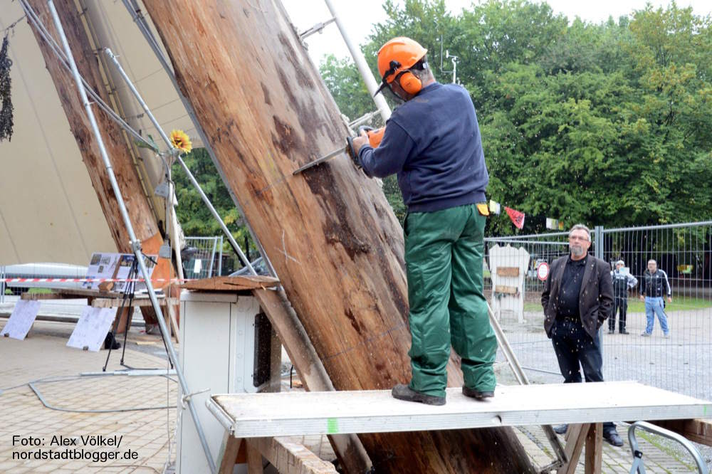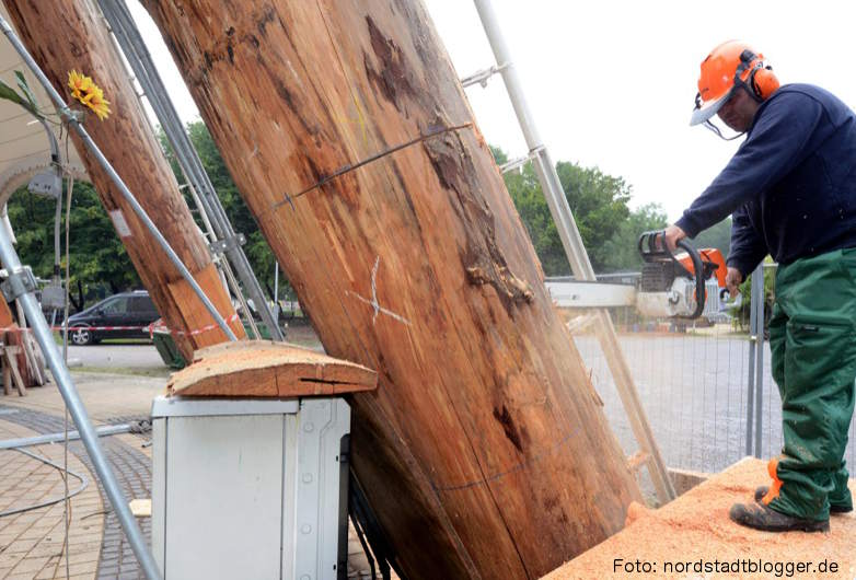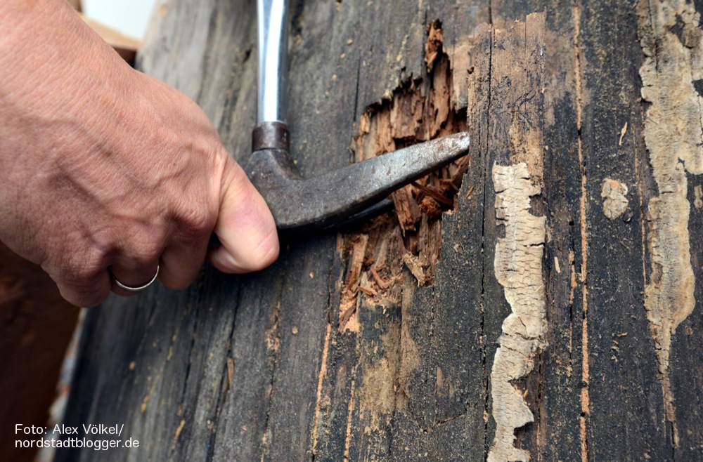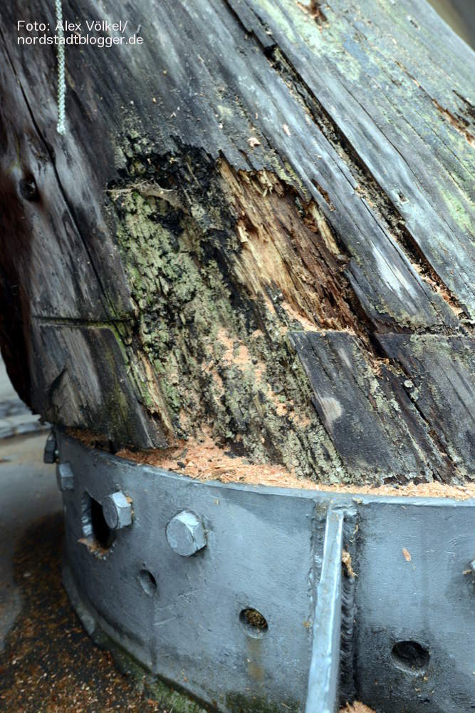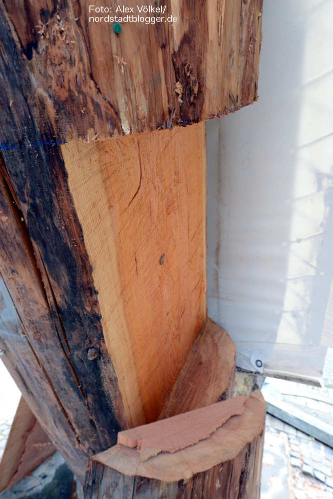 Zur Schadensbeseitigung des Zeltes wird die ursprüngliche Konstruktion durch eine kombinierte Holz-/Stahlkonstruktion ersetzt. Die oberen Stämme mussten bereits im vergangenen Jahr „amputiert“ werden, da diese bei Sturm hätten brechen können. Im Ständerbereich ist das Holz so morsch und verfault, dass man mit bloßen Händen Material rausbrechen kann, erläuterte Hamann. Das wird sich nun ändern.