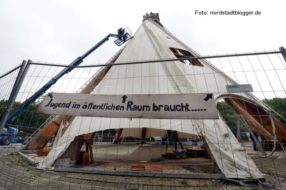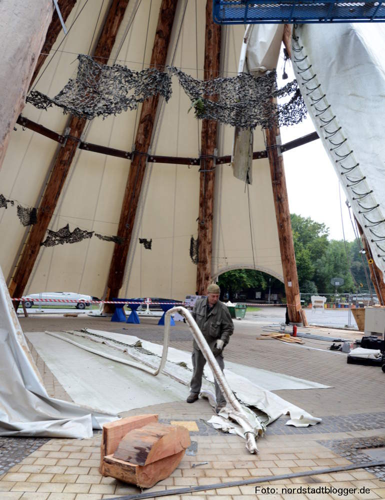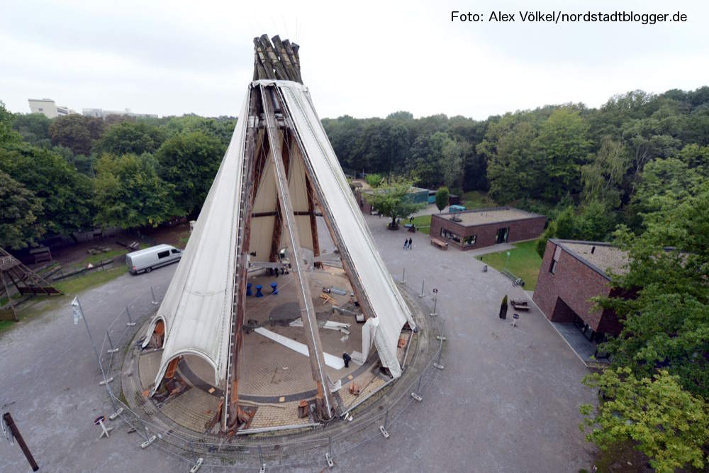 Was sehr lange währt, wird hoffentlich auch gut: So oder so ähnlich ließe sich die fast unendliche Geschichte der Sanierung des „Big Tipi“ zusammenfassen. Die Sanierungsarbeiten an dem Riesen-Indianerzelt in der Nordstadt haben nun endlich begonnen. 670.000 Euro werden in die Sanierung gesteckt. Seit mehr als 2,5 Jahren ist das Herzstück der Erlebniswelt Fredenbaum wegen Baufälligkeit geschlossen.