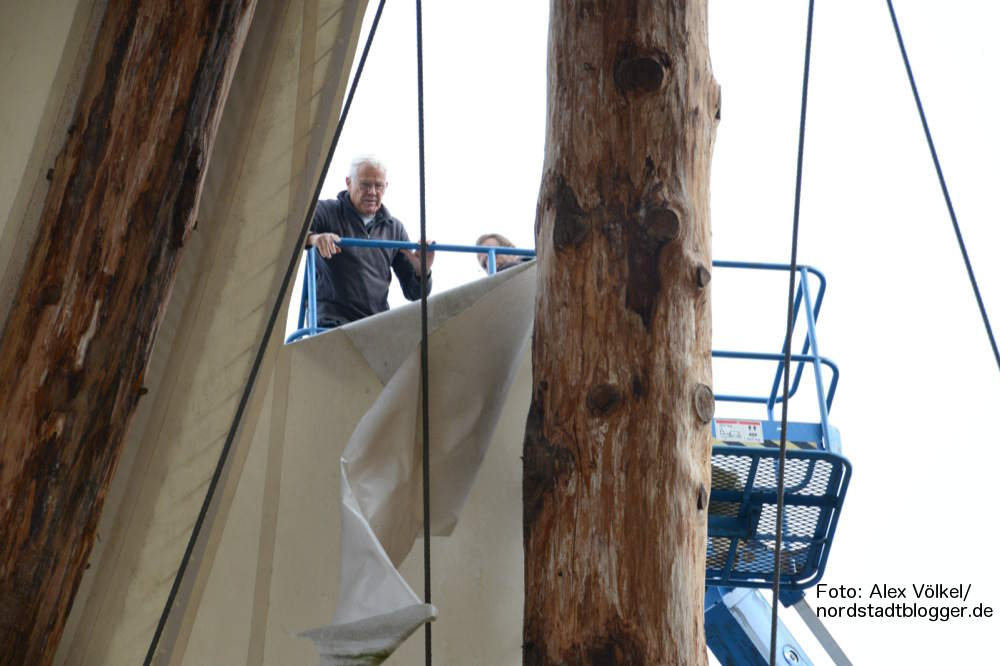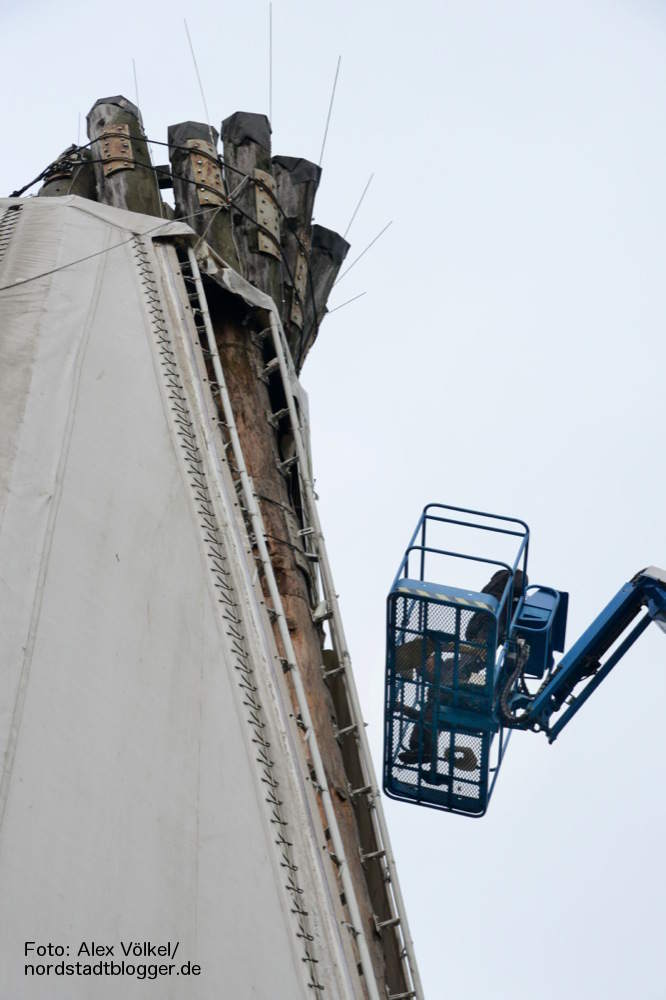 Auch die Spitze wird künftig komplett aus Metall sein. In 16 Metern Höhe wird ein neuer, rund vier Tonnen schwerer Stahlring eingebaut. Alle nicht sichtbaren Bereiche in der Zeltspitze werden durch Stahl ersetzt. Über 25 Tonnen werden dort demnächst verbaut, berichtete Bauleiter Christian Feldhege.