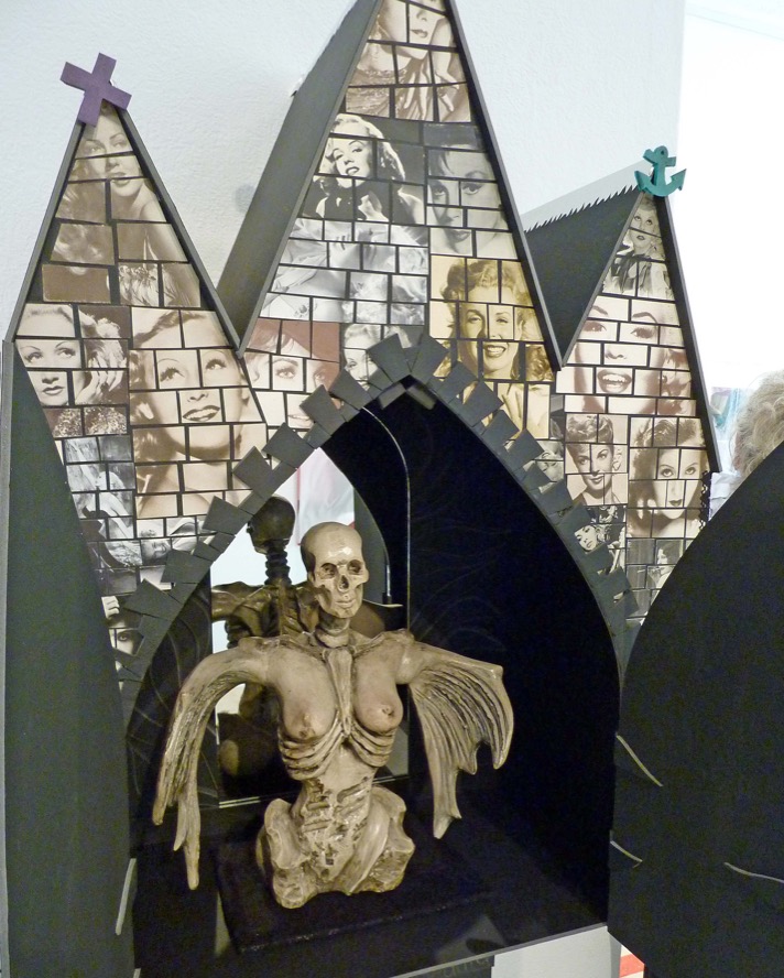 Da ist zum Beispiel „Der Schrein der vergangenen Schönheit“ von Almut Rybarsch-Tarry aus Dortmund. Ein großes, gotisch anmutendes Haus mit drei Türmen. Die Wände und die Tür sind über und über beklebt mit zerschnippelten schwarz-weiß-Fotos weltberühmter Filmstars aus den 60igern und früher. Das Öffnen der großen Tür führt schließlich zur vergangenen Schönheit – dargestellt durch ein Skelett mit flügelähnlichen Armen vor einem Spiegel.