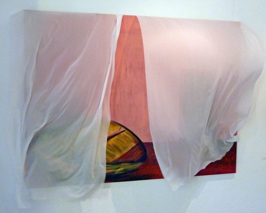 Anke Droste’s Acrylbild „An sich“ zeigt ein Boot, verhängt durch leichte Stoffbahnen. Durch einen zugeschalteten Ventilator bewegt sich der Stoff wie federleichte Gardinen vor einem Fenster.