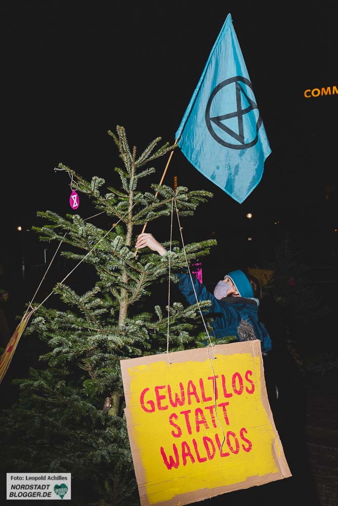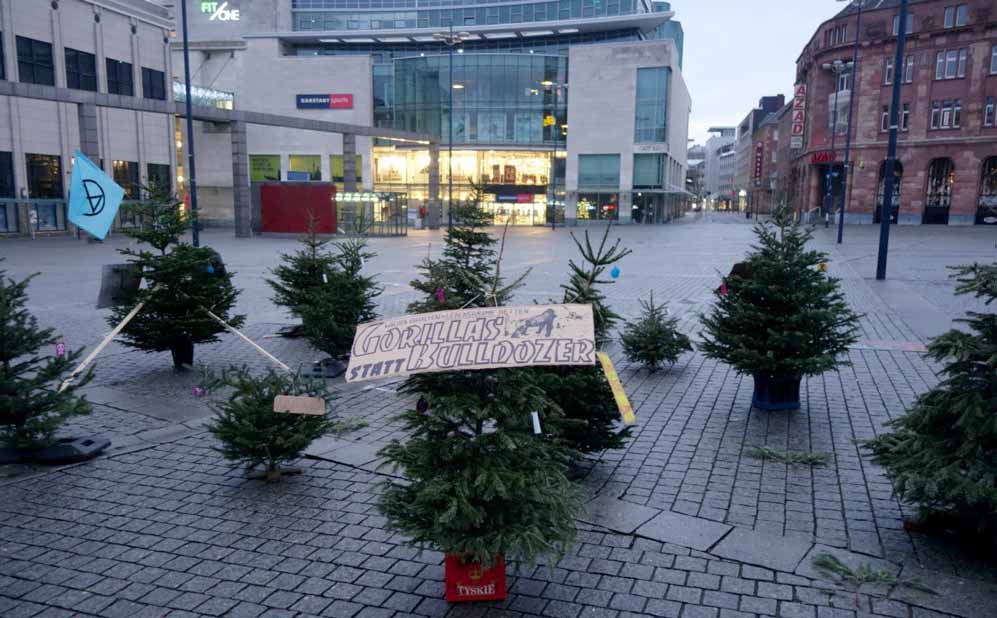 Sinnbildlich für einen sterbenden Wald haben Aktivist*innen der Klima- und Umweltschutz-Gruppe „Extinction Rebellion“ (XR) am Sonntag (10. Januar 2021) bei einer unangemeldeten Aktion aus alten und weggeworfenen Christbäumen auf dem Dortmunder Hansaplatz einen neuen Nadelwald gepflanzt. Mit Schildern wurde auf die Gefährdung der Wälder durch die Klimakrise aufmerksam gemacht und gegen das Abholzen gesunder Wälder protestiert. Die Bäume trugen Plakate mit Aufschriften wie „Wald statt Asphalt“, „Gorillas statt Bulldozer“, „Danni bleibt“ und „Lebensräume erhalten – Wälder schützen“.