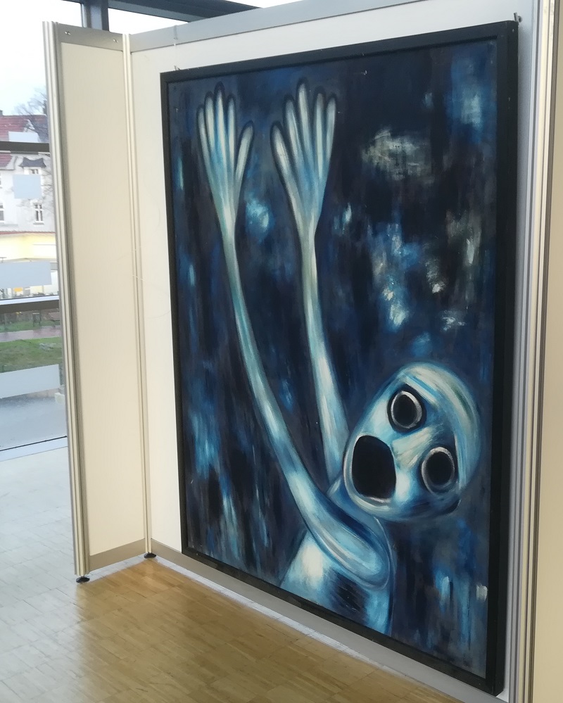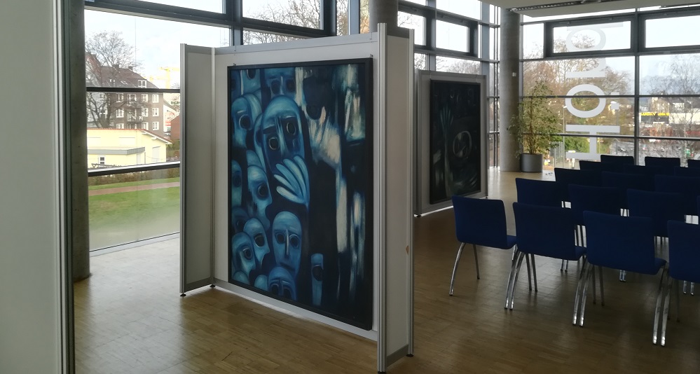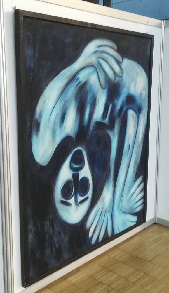 Das Besondere an diesen Werken ist die vorherrschende Farbe Blau in zahlreichen Schattierungen in der Kombination mit erdigen Tönen von eindringlicher Sinnlichkeit. Die abstrakten Bilder lassen gerade durch ihre durchweg blauen Grundtöne, mit ihren verschobenen Körpern, das Leid, die Not und die Kälte erahnen, das die Nazi Schergen ihren einstigen MitbürgerInnen und den Menschen jüdischen Glaubens, deren sie in ihrem irrationalen Rassenwahn habhaft wurden, angetan haben.