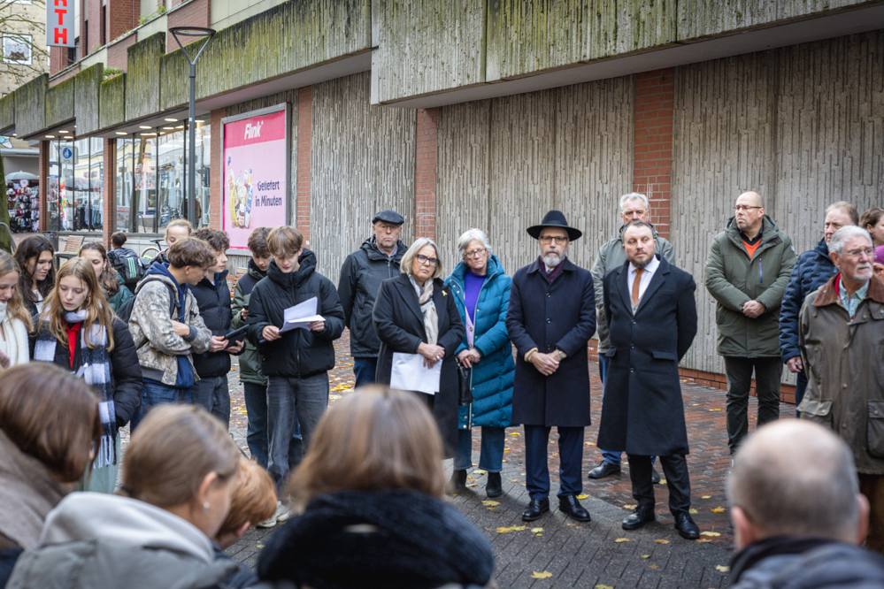 In seiner Ansprache erinnerte Bürgermeister Schilff daran, dass im Juni 1900 bei der Einweihung der Synagoge am Hiltropwall Ecke Hansastraße das Gebäude als Zierde der Stadt für ewige Zeiten bezeichnet worden war. Heute seien die Stolpersteine eine Zierde für die Stadt.
