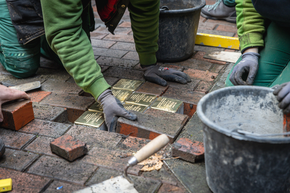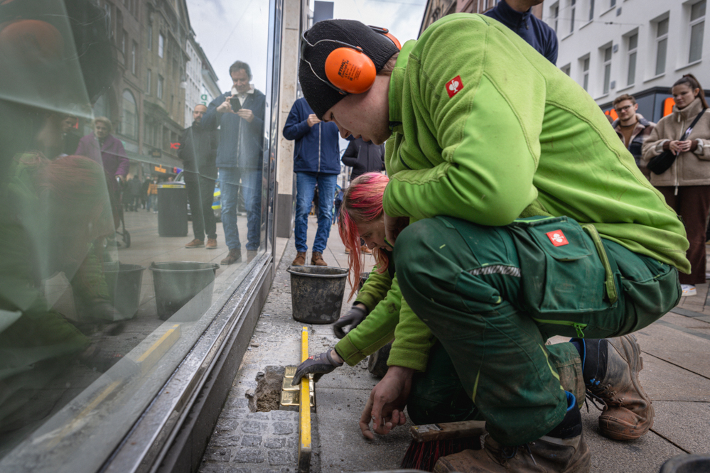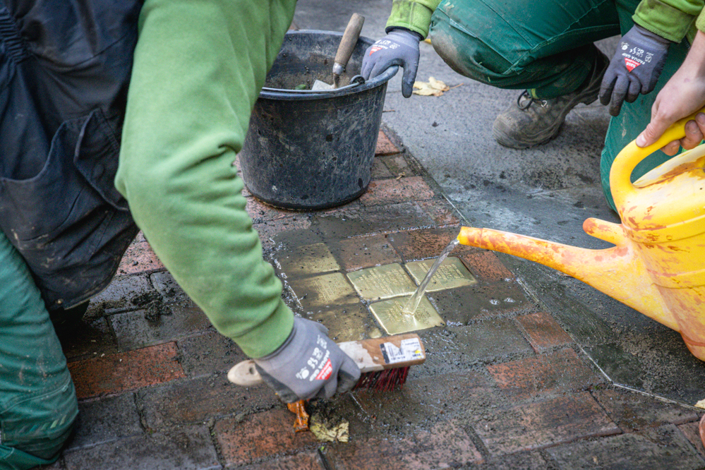 Die eigentlichen Verlegearbeiten wurden von Auszubildenden von Friedhöfe Dortmund ausgeführt. Sie hatten an dem Tag viel zu tun. Denn auch an anderen Orten in der Stadt wurden insgesamt 12 neue Stolpersteine verlegt: