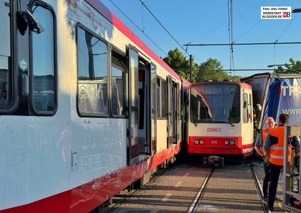 Am Dienstag (13.05.) ereignete sich im Dortmunder Stadtteil Lindenhorst ein Verkehrsunfall, an dem ein LKW und zwei Stadtbahnen beteiligt waren. 13 Personen wurden leicht verletzt, der Schaden liegt im siebenstelligen Bereich.