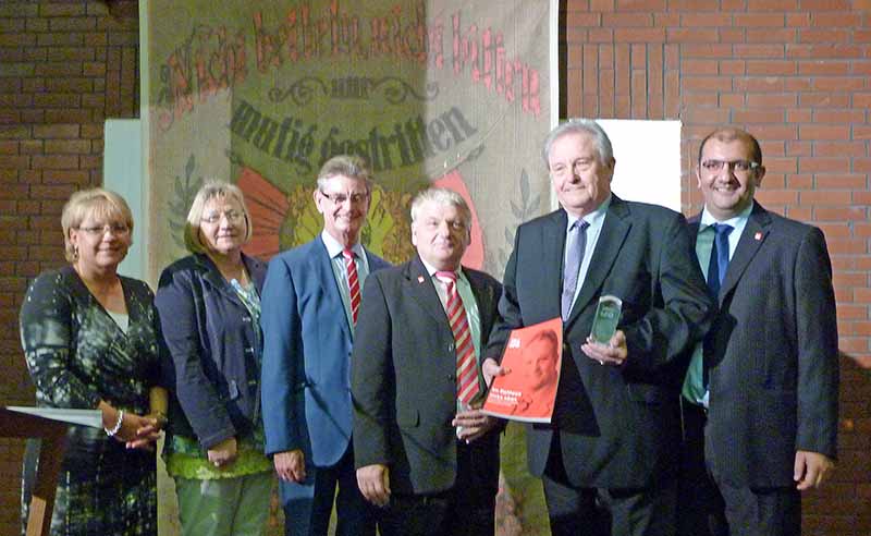 Auf dem Foto von links nach rechts: Ulrike Matzanke, Renate Weyer (stellvertretende Fraktionsvorsitzende), MdL Norbert Römer, SPD-Fraktionschef Norbert Schilff, Ernst Prüsse und Volkan Baran (stellv. Fraktionsvorsitzender). Foto: Joachim vom Brocke
