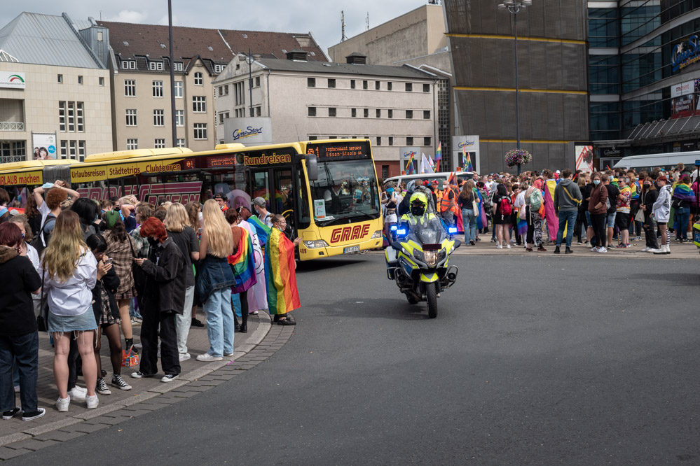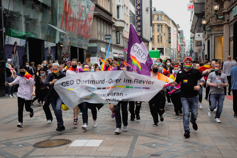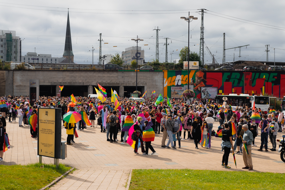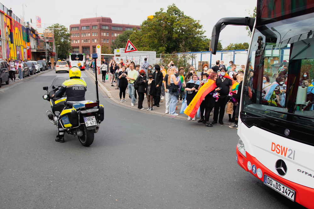 Ein Meer aus Fahnen und bunt gekleideten Menschen zog am Samstagmittag (11. September 2021) über den Wallring und den Westenhellweg. Mit der großen Demo zum Christopher Street Day (CSD) forderten die Teilnehmer*innen mehr Solidarität und gleiche Rechte für die LSBTIQ*-Community (lesbisch, schwul, bisexuell, trans*, inter*, queer). Unfallbedingt verzögerte sich der Start zunächst.