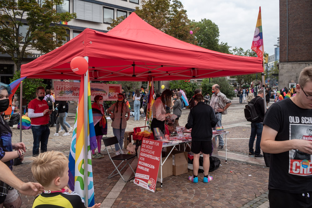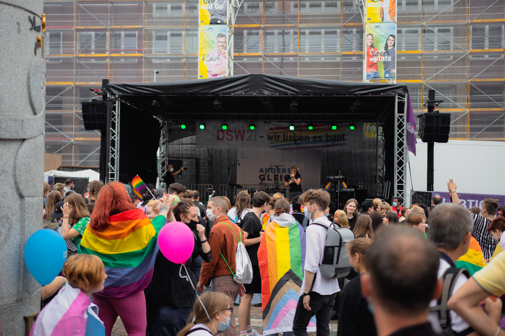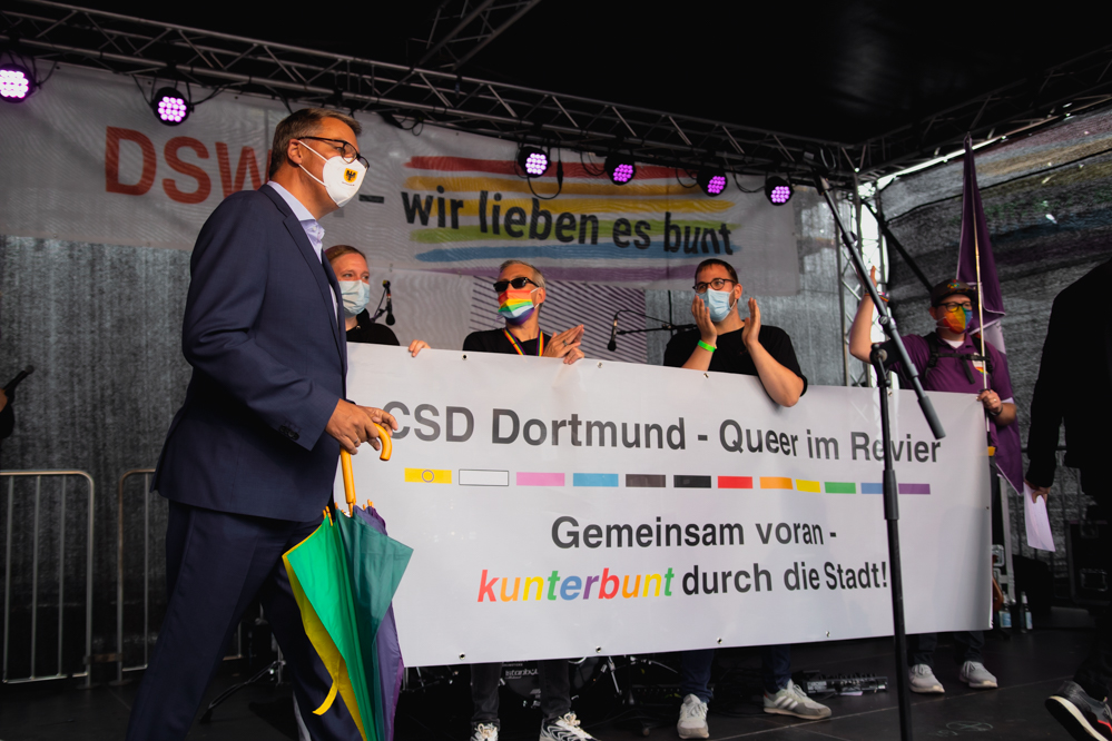 „Das ist auch eine gute Nachricht für ein buntes, offenes tolerantes Dortmund“, erklärte Westphal. Der Begrüßung folgte ein buntes Bühnenprogramm aus Musik und Talk. Auch Bundestagskandidat*innen wurden auf der Bühne zu für die LSBTIQ*-Community relevanten Themen befragt.