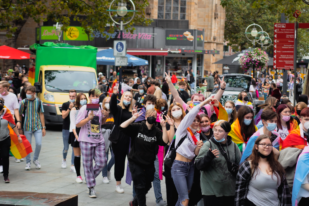 Dort endete die Demonstration mit einer kurzen Kundgebung. Thematisiert wurden unter anderem die Belastung für die Jugendlichen in der Corona-Pandemie. So hätten Jugendliche im Lockdown keine Auszeit mehr von ihren Familien gehabt, die sie nicht so akzeptieren, wie sie sind, erinnerte Moritz Heller von SLADO.