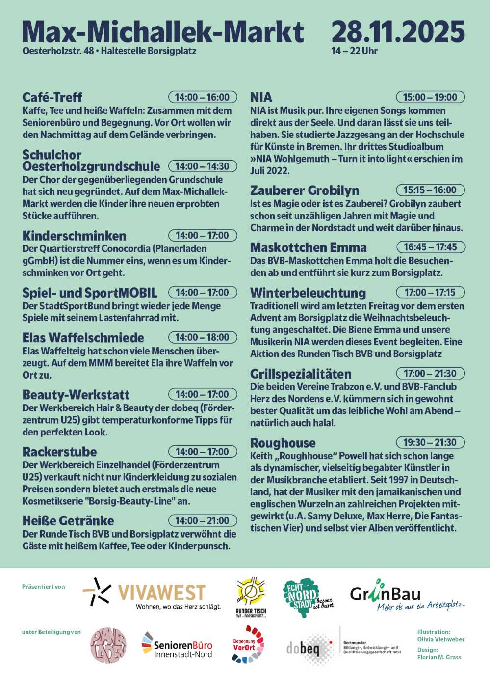 Der Max-Michallek-Platz verwandelt sich am 28. November 2025 in einen winterlichen Markt. Von 14 bis 22 Uhr erwartet die Besucher:innen ein buntes Programm mit Musik, Kinderaktionen, kulinarischen Angeboten und handwerklichen Ständen. Der neue Max-Michallek-Markt (MMM) wird von GrünBau gGmbH organisiert und durch das StadtbezirksMarketing Dortmund sowie Vivawest unterstützt. Gemeinsam mit dem Verein Runder Tisch BVB – Borsigplatz wird zudem die traditionelle Weihnachtsbeleuchtung am Borsigplatz eingeschaltet.