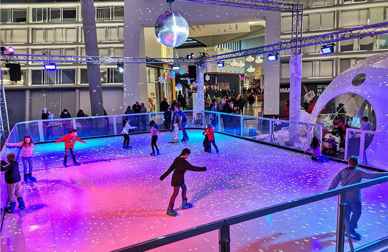 Herzstück ist eine umweltfreundliche Kunsteisbahn, die ohne Wasser und energieintensive Kühlung auskommt. Sie wirkt wie echtes Eis und bietet eine spiegelglatte Fläche für alle Generationen. Wer keine eigenen Schlittschuhe hat, kann Leihschlittschuhe in den Größen 25 bis 48 kostenlos nutzen. Begleitende Musik und Beleuchtung sorgen dabei für eine stimmungsvolle Atmosphäre.