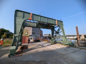 Die Restaurierung war schließlich im Sommer so weit gediehen, dass der Portaldrehkran aus dem Jahre 1908 nun an seinen neuen Standort umgesetzt werden kann. Keine einfache Aktion! Immerhin sollte er gemäß älterer Unterlagen rund 35 Tonnen auf die Waage bringen.
