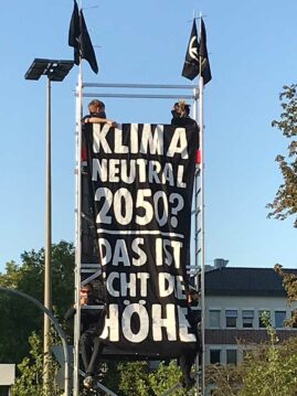 Am Mittwochnachmittag besetzen etwa 60 Aktivist*innen der Bewegung Extinction Rebellion (XR) die Kreuzung Südwall/Ruhrallee und deren vier Zufahrten in der Dortmunder Innenstadt. Mit dieser Aktion zivilen Ungehorsams wollen sie auf die Klimakrise aufmerksam machen und fordern eine zügigere Wende zur Klimaneutralität der Stadt Dortmund. Mehrere Aktivist*innen haben sich dabei an und auf einem über sechs Meter hohen Gerüst festgekettet, das in der Mitte der Kreuzung aufgestellt wurde. Große Transparente (u.a: „Klimaneutral 2050? – Das ist echt die Höhe!“) verdeutlichen die Botschaft der friedlichen Protestaktion.