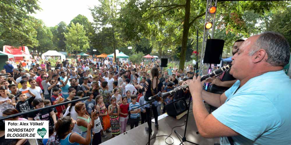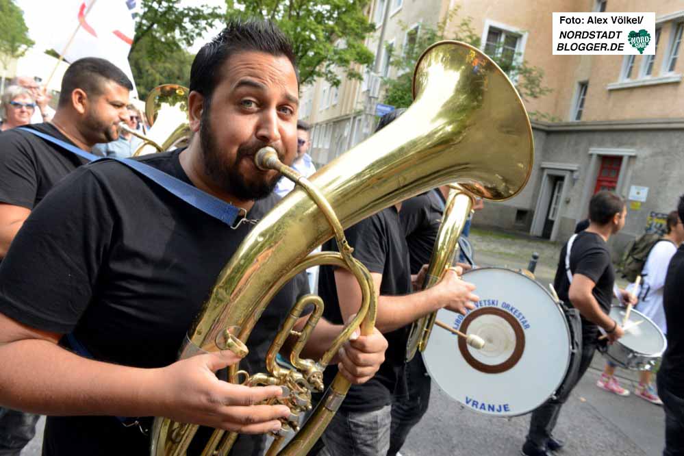 Am letzten Festivaltag – führte die „Balkan Brass Band Deutschland“, eine Roma-Band aus dem Süden Serbiens, am frühen Nachmittag einen Demonstrationszug durch die Dortmunder Nordstadt an. Von der Stollenstraße aus ging es über Alsenstraße und Schleswiger Straße, dabei zweimal die Mallinckrodtstraße querend – zum Nordmarkt.
