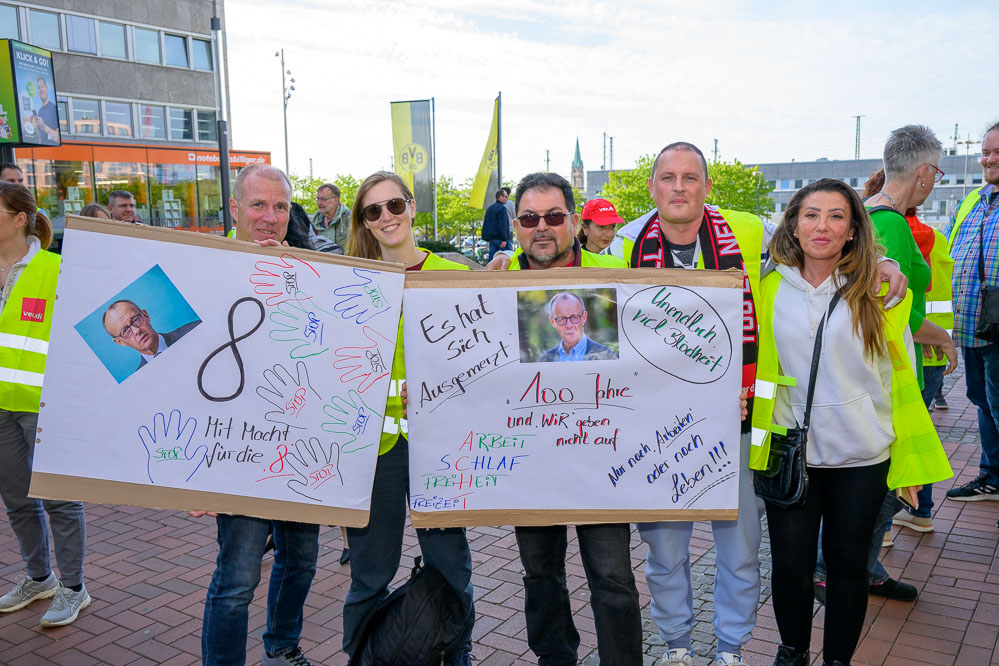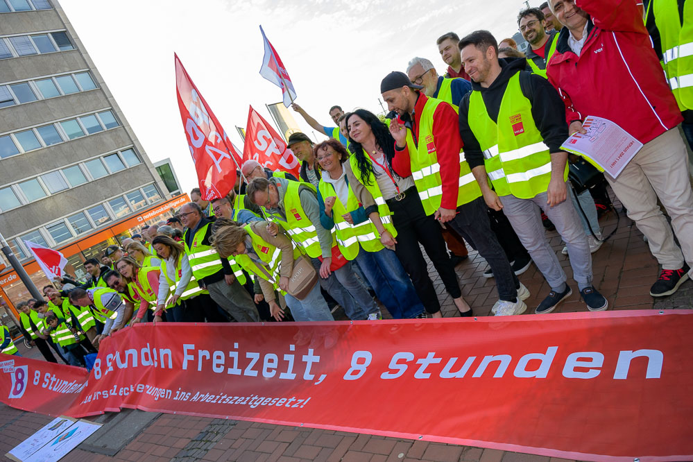 Mit Bannern, Plakaten und Redebeiträgen machten die Demonstranten deutlich, dass die Acht-Stunden-Reglung nicht nur ein arbeitsrechtlicher Richtwert, sondern ein zentrales Schutzrecht der Arbeitnehmer:innen ist, um Gesundheit, Freizeit und gesellschaftliche Teilhabe zu vergewissern.