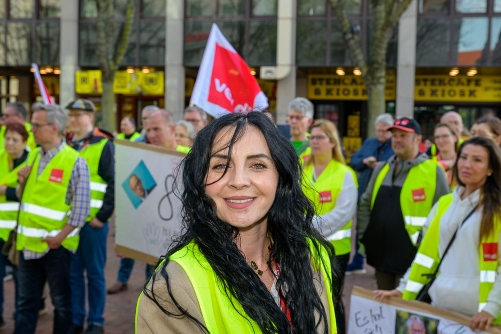 Andelina Hacker aus der Edeka-Logistik macht auch in ihrer Ansprache deutlich, wie groß der Druck im Arbeitsalltag bereits heute sei. Denn die Arbeit in der Logistik ist sowohl psychisch als auch körperlich belastend, genau deswegen gibt es den Acht-Stunden-Tag als Schutz.