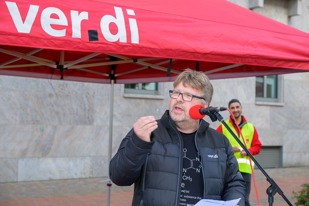 Der Acht-Stunden-Tag ist für Thomas Großstück kein Luxus, sondern eine hart erkämpfte Errungenschaft der Arbeiterbewegung seit 1918: „Heute mit Macht für die Acht“, ruft der Landesfachbereichsleiter deshalb gleich zu Beginn seiner Rede und bringt damit die zentrale Forderung der Demonstration auf den Punkt.
