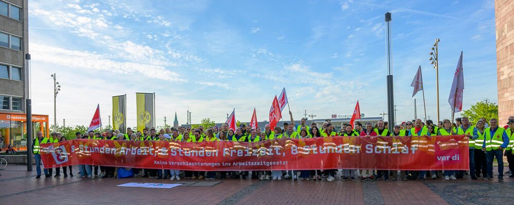Mit dem Motto „Mit Macht für die Acht“ versammelten sich jetzt zahlreiche Menschen vor der Katharinentreppe am Hauptbahnhof in Dortmund, um für den Erhalt des Acht-Stunden-Tages zu demonstrieren. Aufgerufen hatte der Fachbereich E (Postdienste, Speditionen und Logistik) der Gewerkschaft ver.di in NRW. Sie warnen vor der aktuelle Debatte in der Bundesregierung, den Acht-Stunden-Tag abzuschaffen.