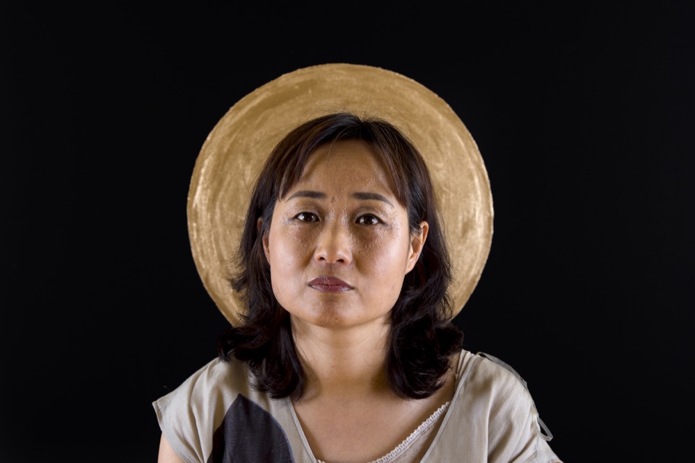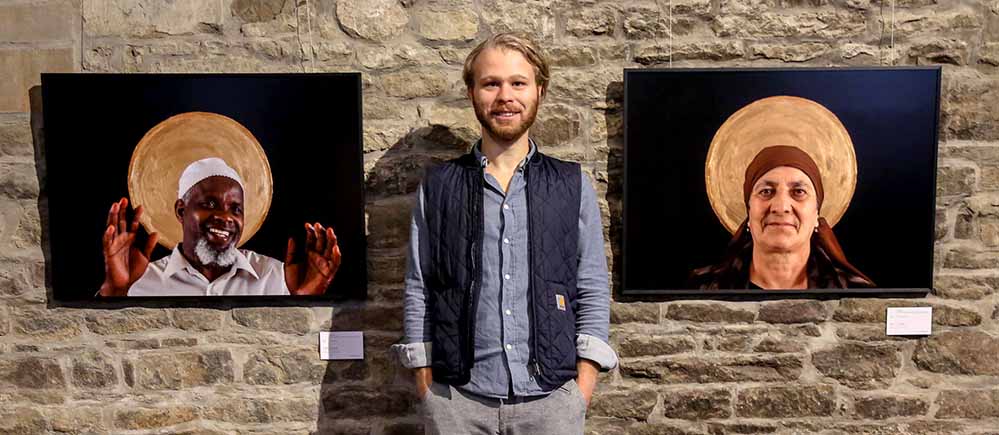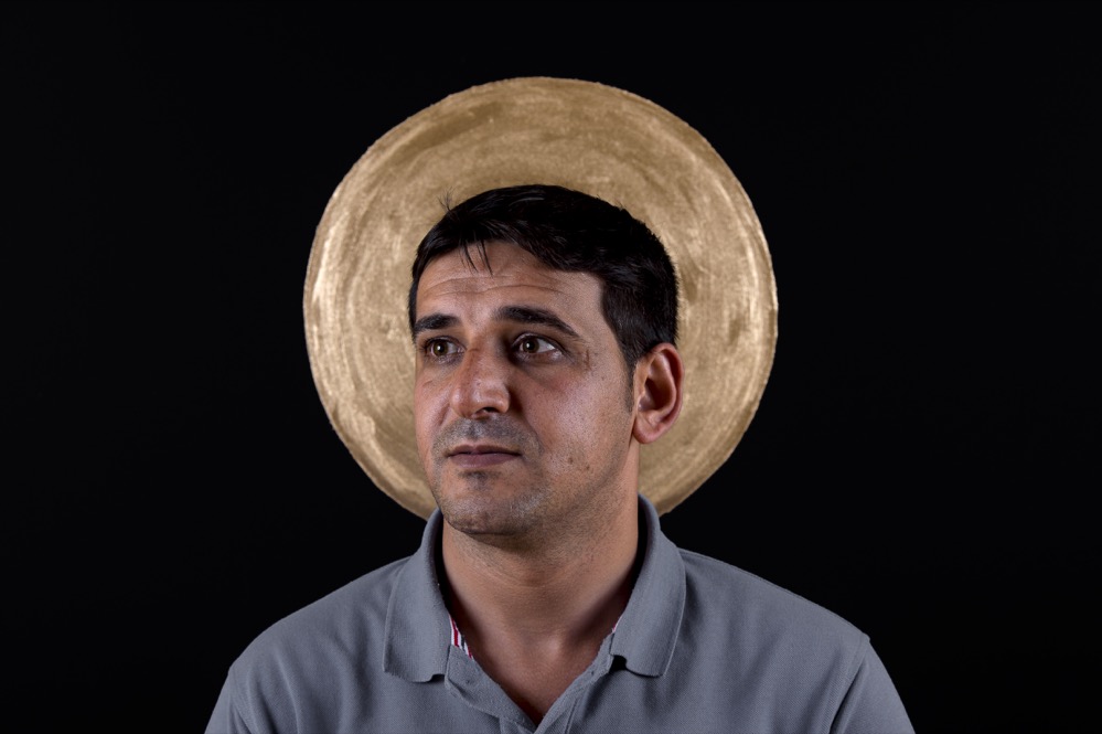 Inspiriert durch die Ikonenmalerei der orthodoxen Kirche hat Nils Laengner Menschen unterschiedlichster Kulturen und Lebenssituationen im Studio vor einem goldenen Kreis auf schwarzem Grund abgelichtet.