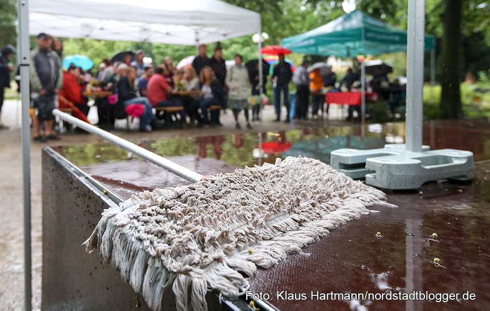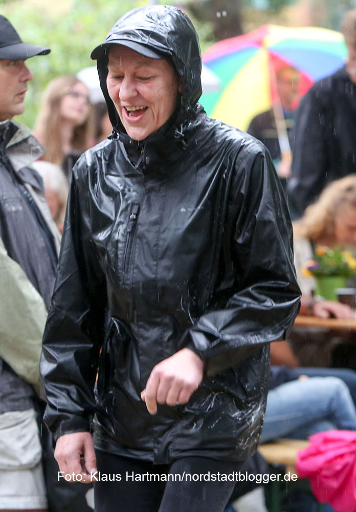Gute Laune unter Zelten und Pavillons trotz des Regens