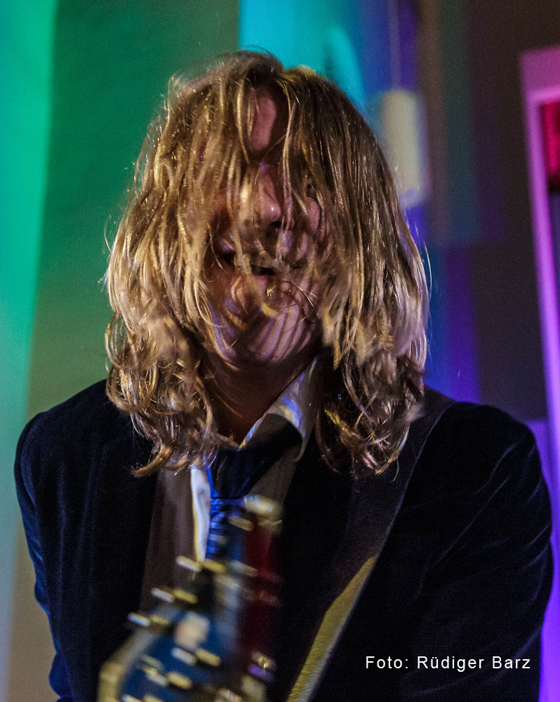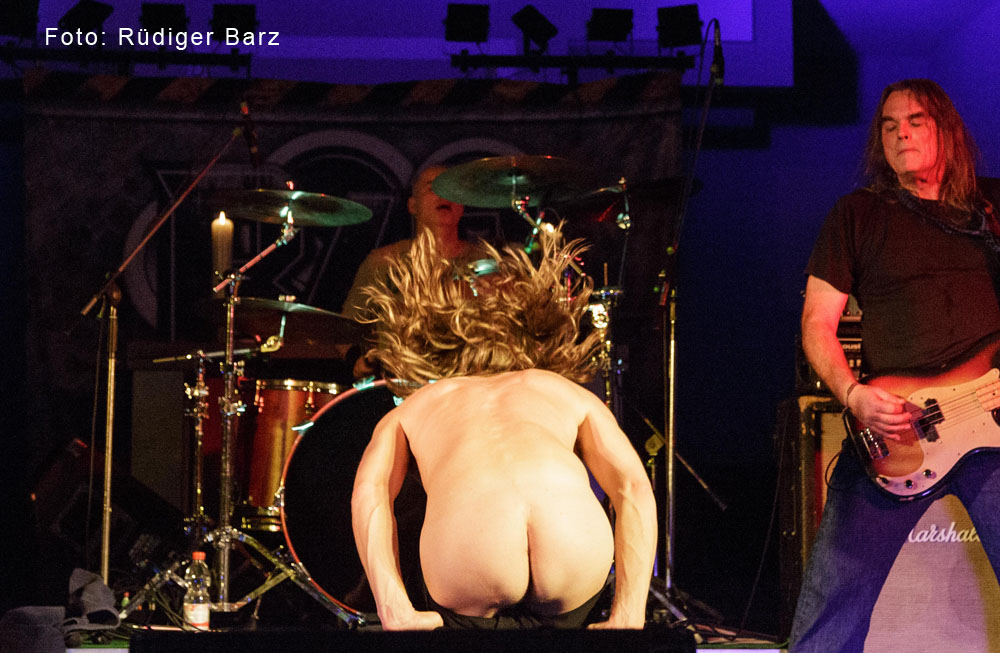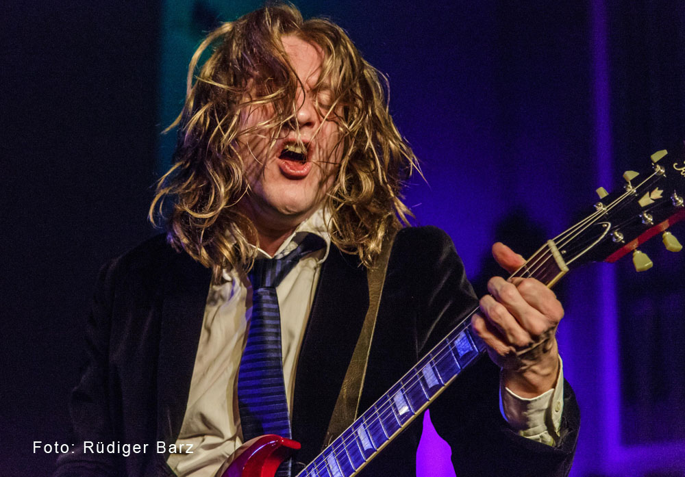 Leadgitarrist Köbes Timmermann begeisterte das Publikum mit seiner rasanten Angus Young-Show, in dem er tanzend, springend und oberkörperfrei an sein Vorbild anschloss.