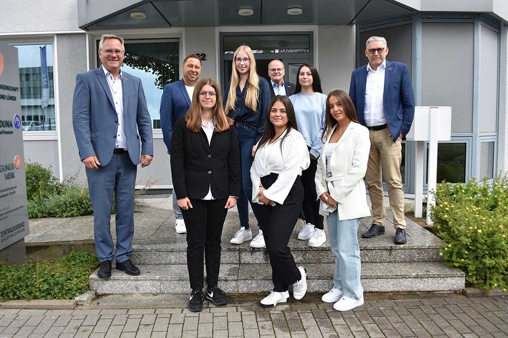 Zum Beginn des neuen Ausbildungsjahres begrüßten jetzt die Geschäftsführung der Kreishandwerkerschaft Dortmund und Lünen und des Bildungskreises Handwerk e.V. ihre neuen Auszubildenden. Insgesamt fünf angehende Kauffrauen für Büromanagement verstärken für die kommenden drei Jahre die Organisationen des Handwerks an der Langen Reihe in Dortmund Körne. Bei der Kreishandwerkerschaft beginnen Lea Benjamins und Jana Trottenberg aus Dortmund sowie Valentina Coletta aus Bönen ihre Ausbildung. Beim Bildungskreis Handwerk treten Dilara Turan und Sueda Toluli ihren Dienst an. Sie kommen ebenfalls beide aus Dortmund.