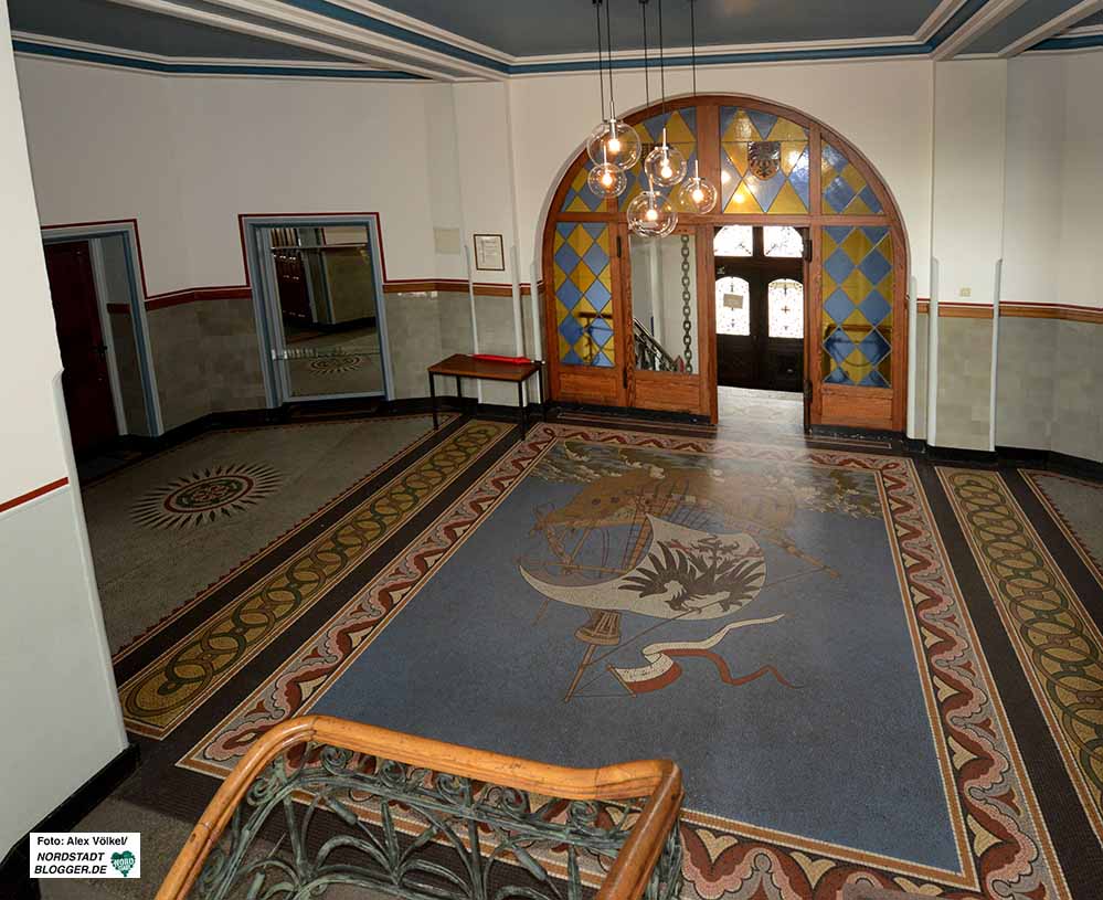 Das als Landmarke, mit seinem 38 Meter hohen Turm, weithin sichtbare Gebäude beherbergt in seiner Flurhalle einen Mosaikboden, auf dem eine mittelalterliche Kogge mit gehissten Segeln abgebildet ist. Auf dem Segel findet sich der Dortmunder Adler und an der Mastspitze weht der rot-weiße Wimpel der Stadt. Ein von Dreiviertelsäulen umrahmtes Portal endet in einem ausgemeißelten Neptunkopf.