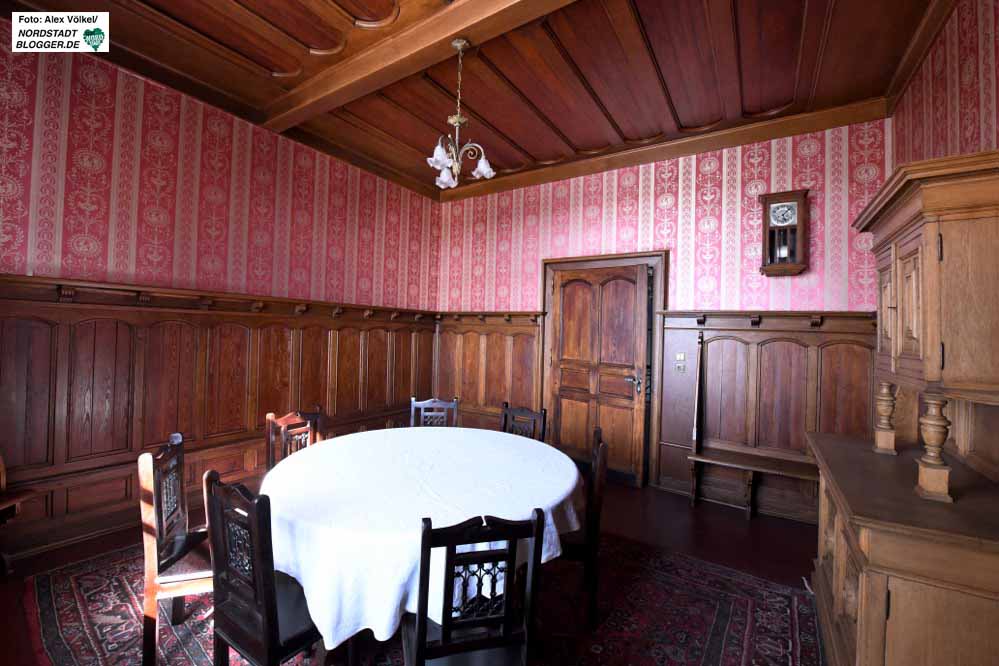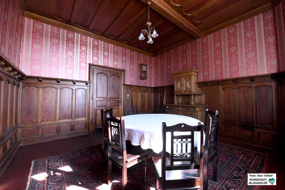 Über dem Gesims enthält eine Gedenkplatte aus Granit in einem Bronzerelief das Bildnis von Wilhelm II. und erinnert so an den Besuch des deutschen Kaisers am 11. August 1899. Unter der Brüstung des Turmzimmers finden sich, von Delphinen getragen, die Wappen der Städte Emden und Dortmund.